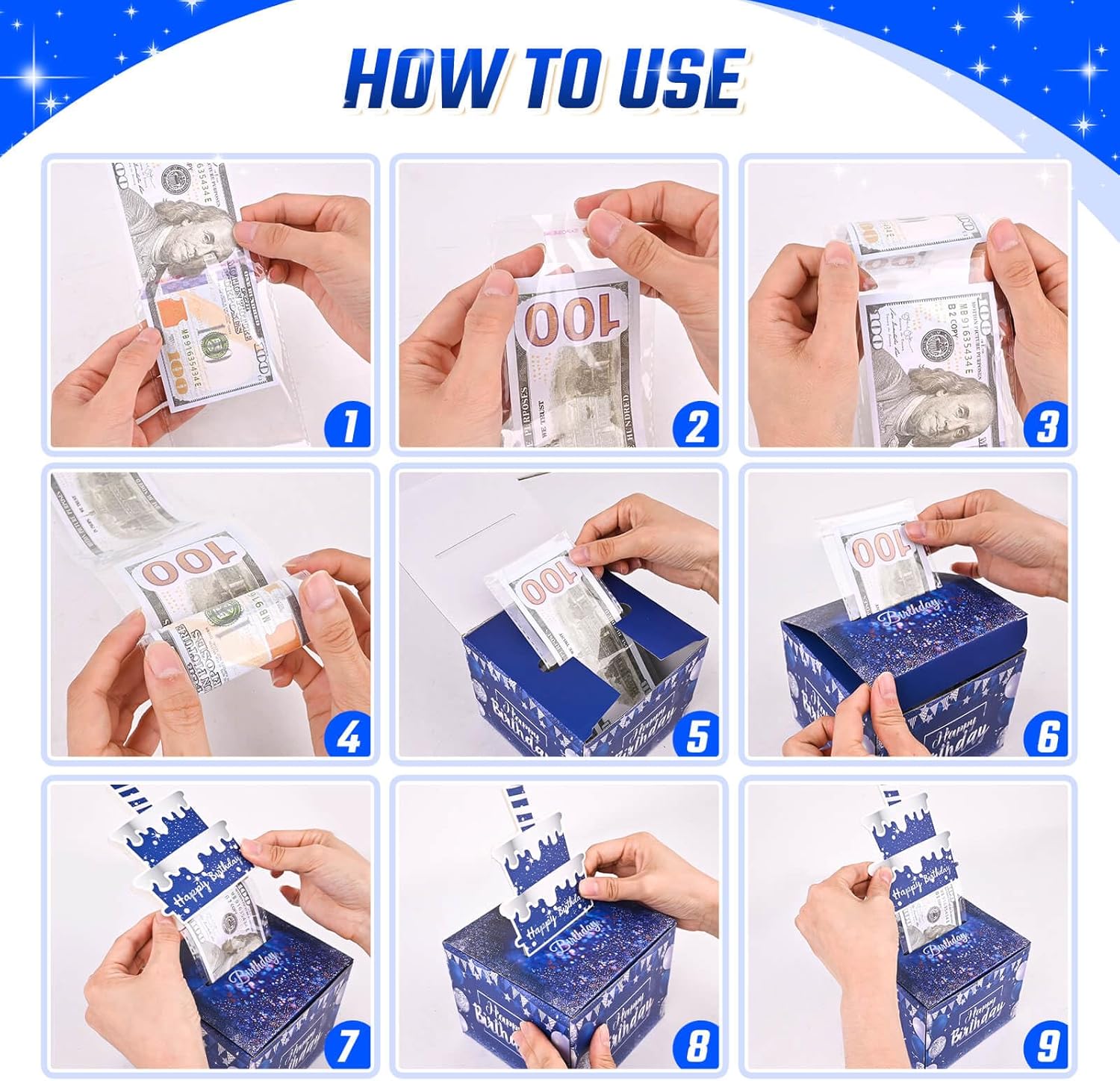 【Easy to Assemble】First, put the money in a plastic bag. Second, paste the plastic bag together. Third, roll up the money, put it in the box, and pull out one end of the plastic bag from the drawer slot to paste it with the birthday cake card. Fourth, remove the adhesive backing from the DIY self-adhesive age stickers and stick the age stickers on both sides of the cake card.then One pull and the money will flow out.