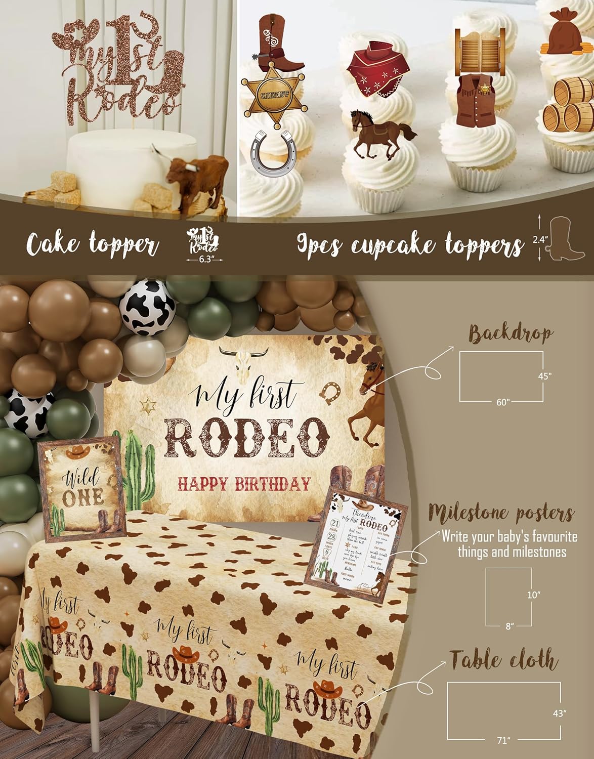 Western First Birthday Decorations – Package includes: My first rodeo backdrop, one balloon box, my first rodeo cake topper, 9pcs western cupcake toppers, 1st birthday high chair banner, western 1st birthday hat, western 1st birthday bandana,1st birthday baby monthly milestone photo banner, number 1 foil balloon, 1st birthday milestone posters, my first rodeo table cloth, 105pcs blue balloon garland set.