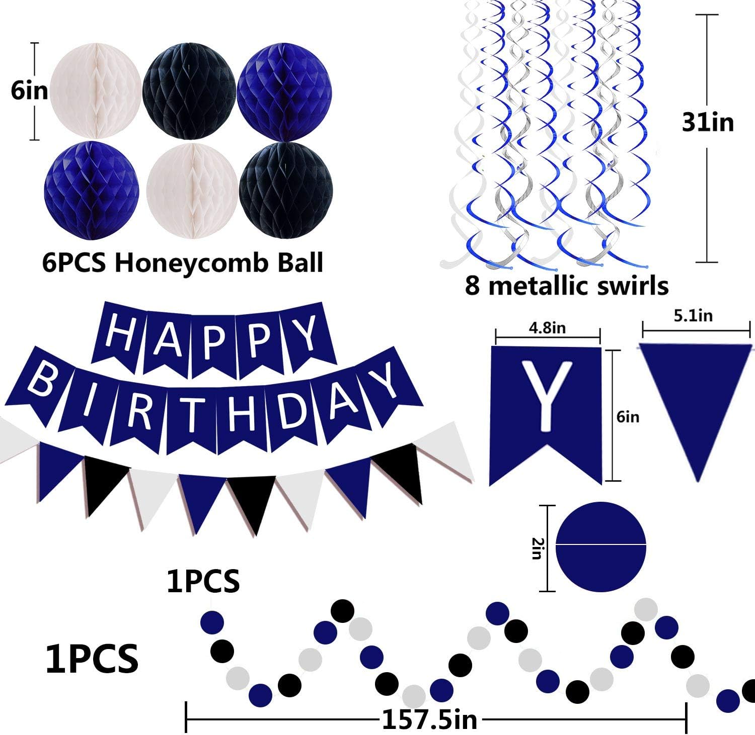 Product Size: The Blue banner Each paper card is 6″x4.8″. honeycomb dia is 6″,circle garland is 157.5″,each Triangle bunting is 5.1″, Each swirls is 31″, they are so easy to hang and perfect for your Birthday party decoration.