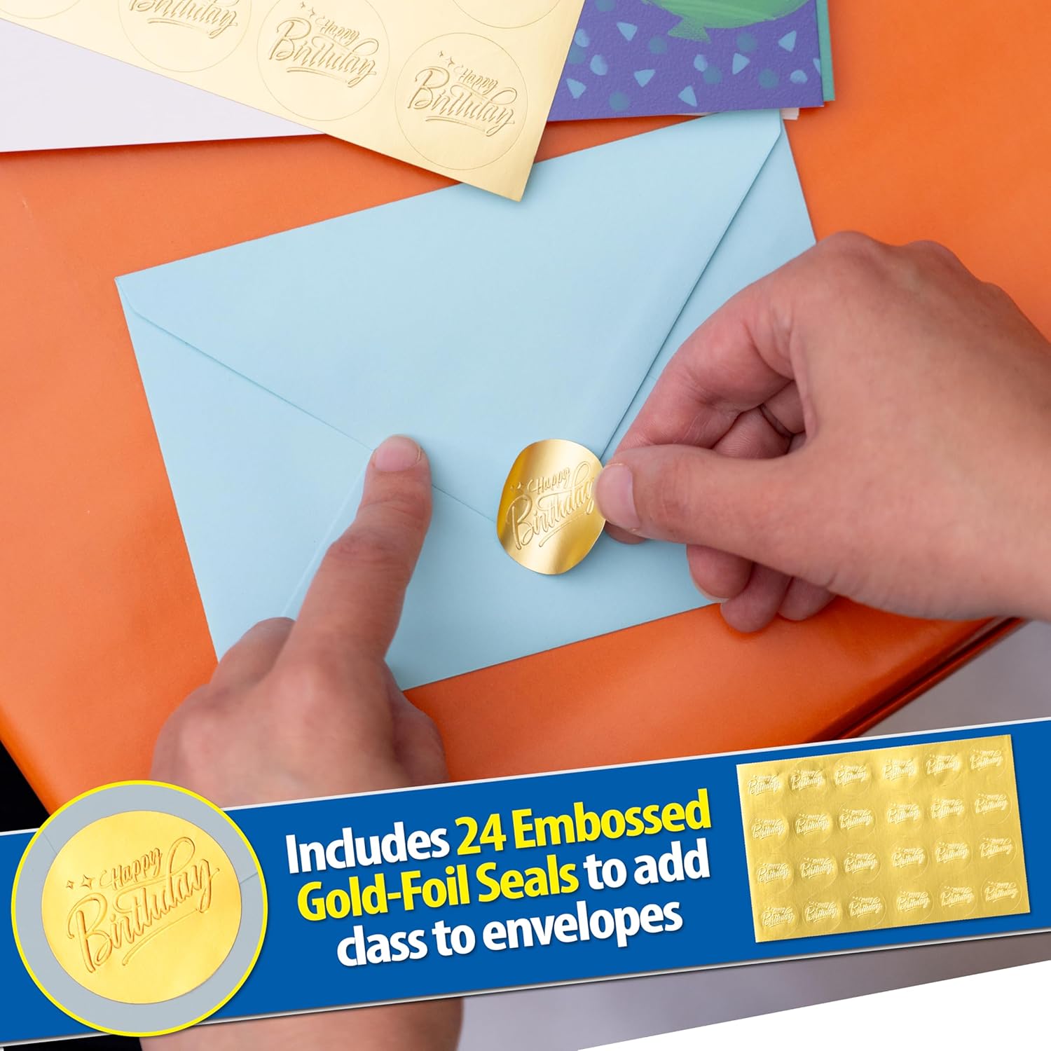 Make any birthday extra special with our elegant 24-piece gold foil card set. Includes 24 cards, 24 colored envelopes, and 24 gold sealing stickers. Suitable for any age or gender, these cards are the perfect addition to any celebration.