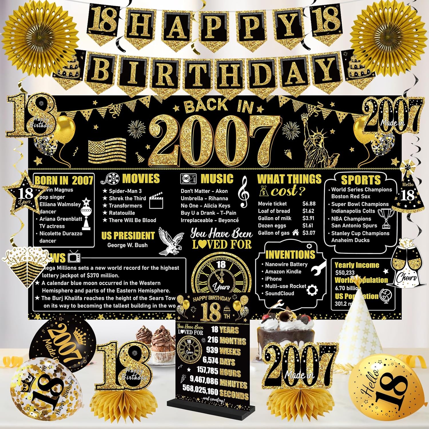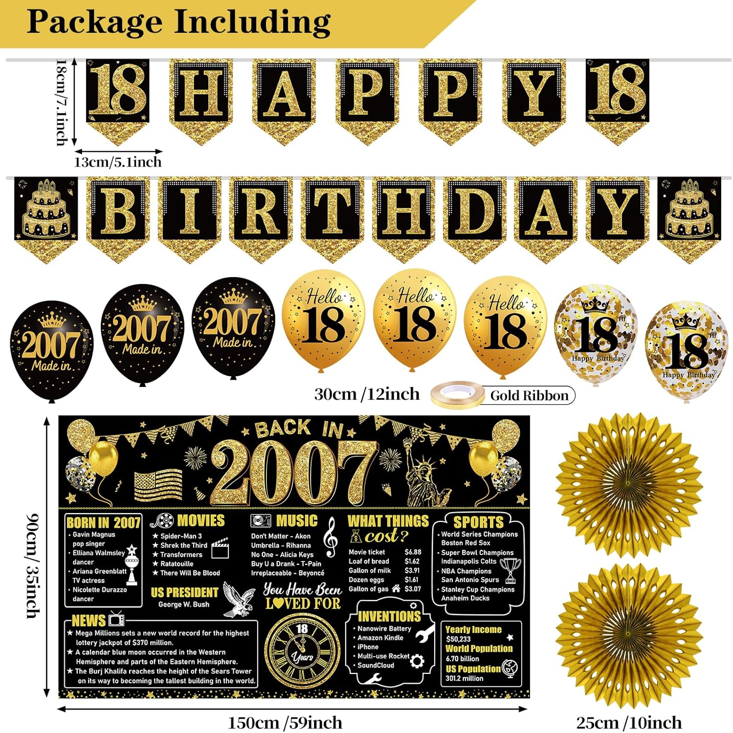 18th Birthday Decorations Kit: 1 Back in 2007 Banner Backdrop,1 Back in 2007 Table Poster Card,1 “18 Happy Birthday” banner, 6pcs Hanging Swirl, 8pcs 12inch balloons,2pcs Honeycomb Centerpiece, 2pcs 10 inch paper fan. The 18th theme birthday party decoration kit is enough to meet your decorating needs and easily create a strong birthday atmosphere in your home