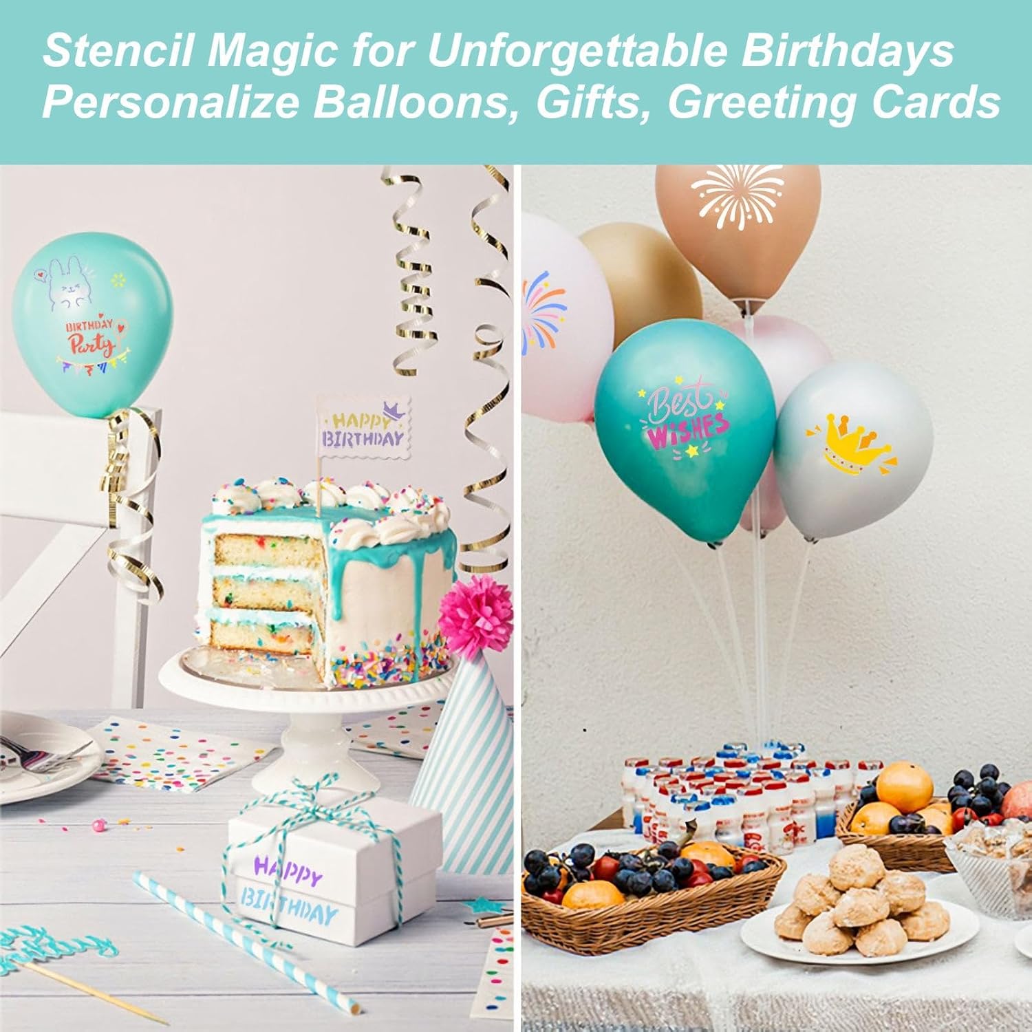 Transform your birthday celebrations with our carefully curated set of 64 premium birthday-themed stencils. Each 3×3 inch template features charming designs including cute bears, rainbows, crowns, cakes, balloons, gift boxes, fireworks, and “Happy Birthday” text patterns.