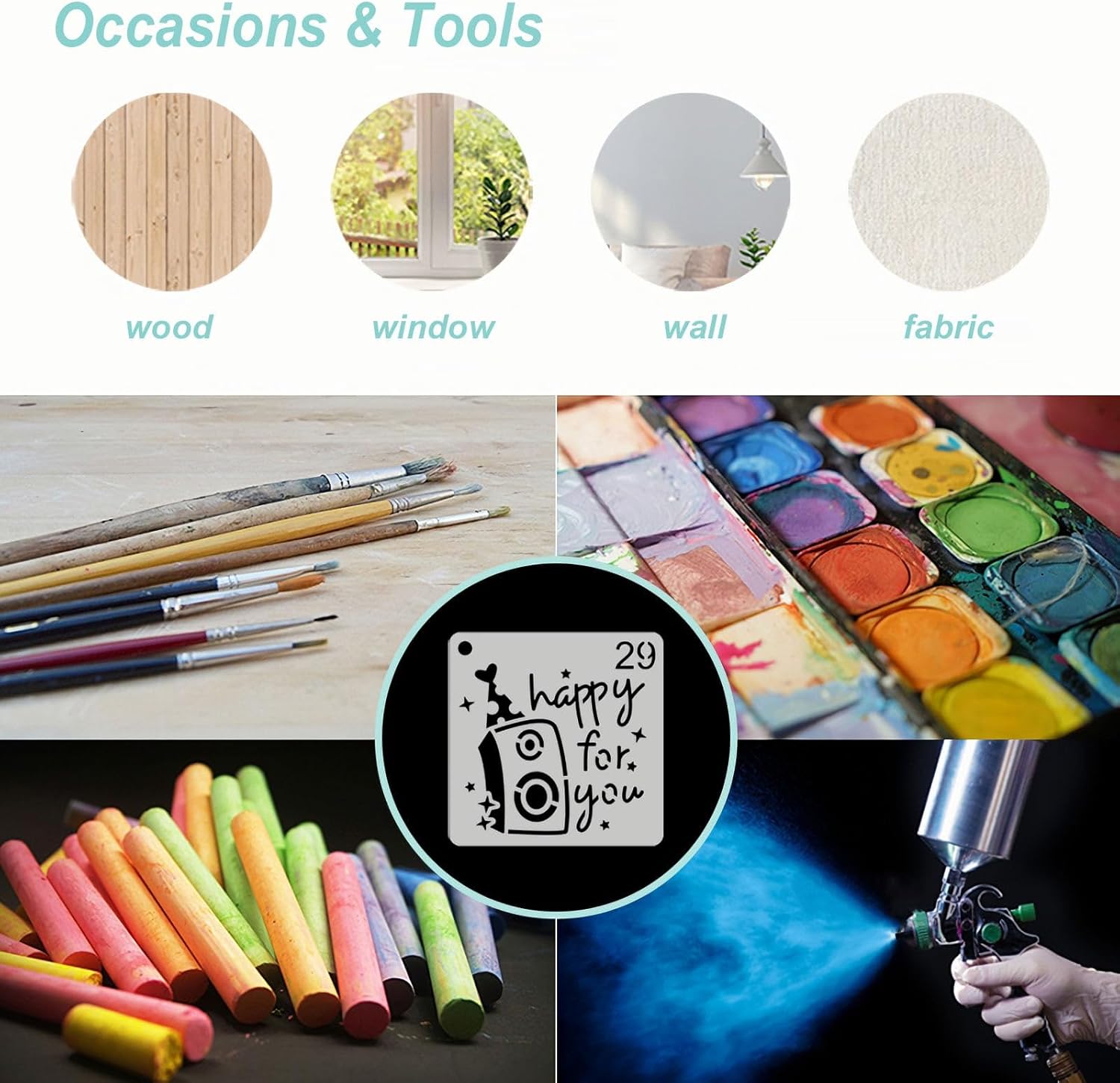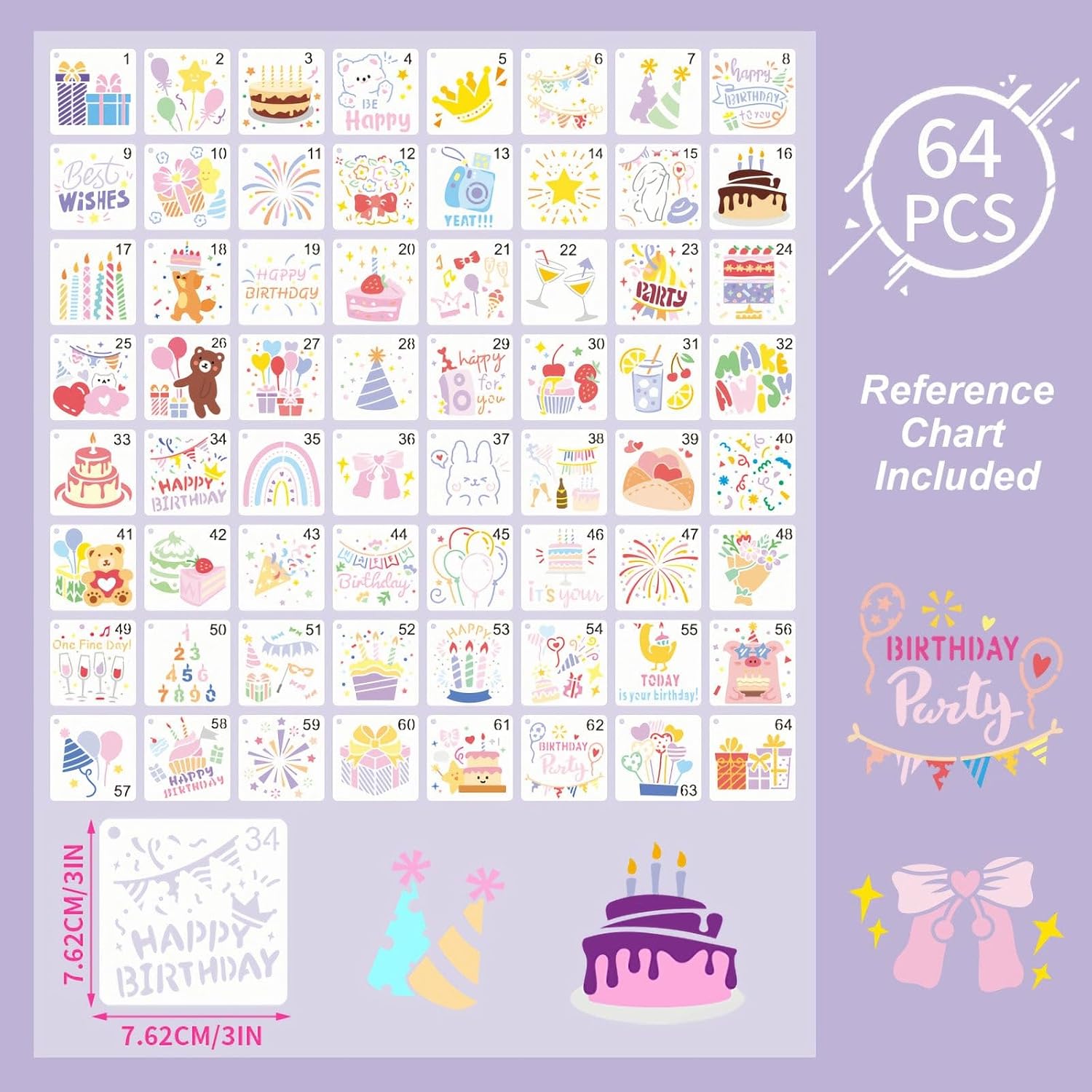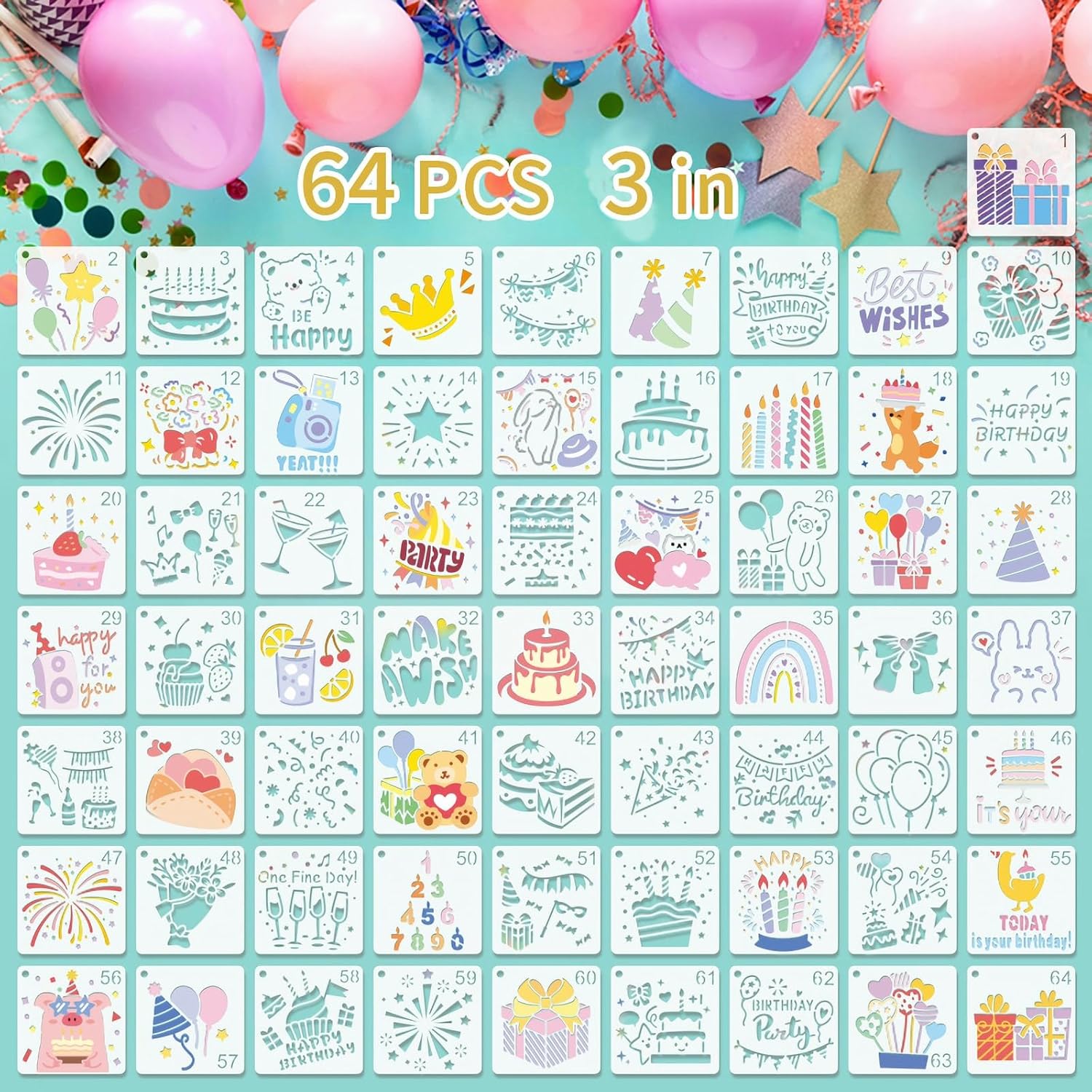 【Complete Birthday Stencil Set】64PCS 3×3 inch premium stencils for painting in birthday theme design; Perfect size for cards, gifts and party decorations with smooth edges for precise crafting