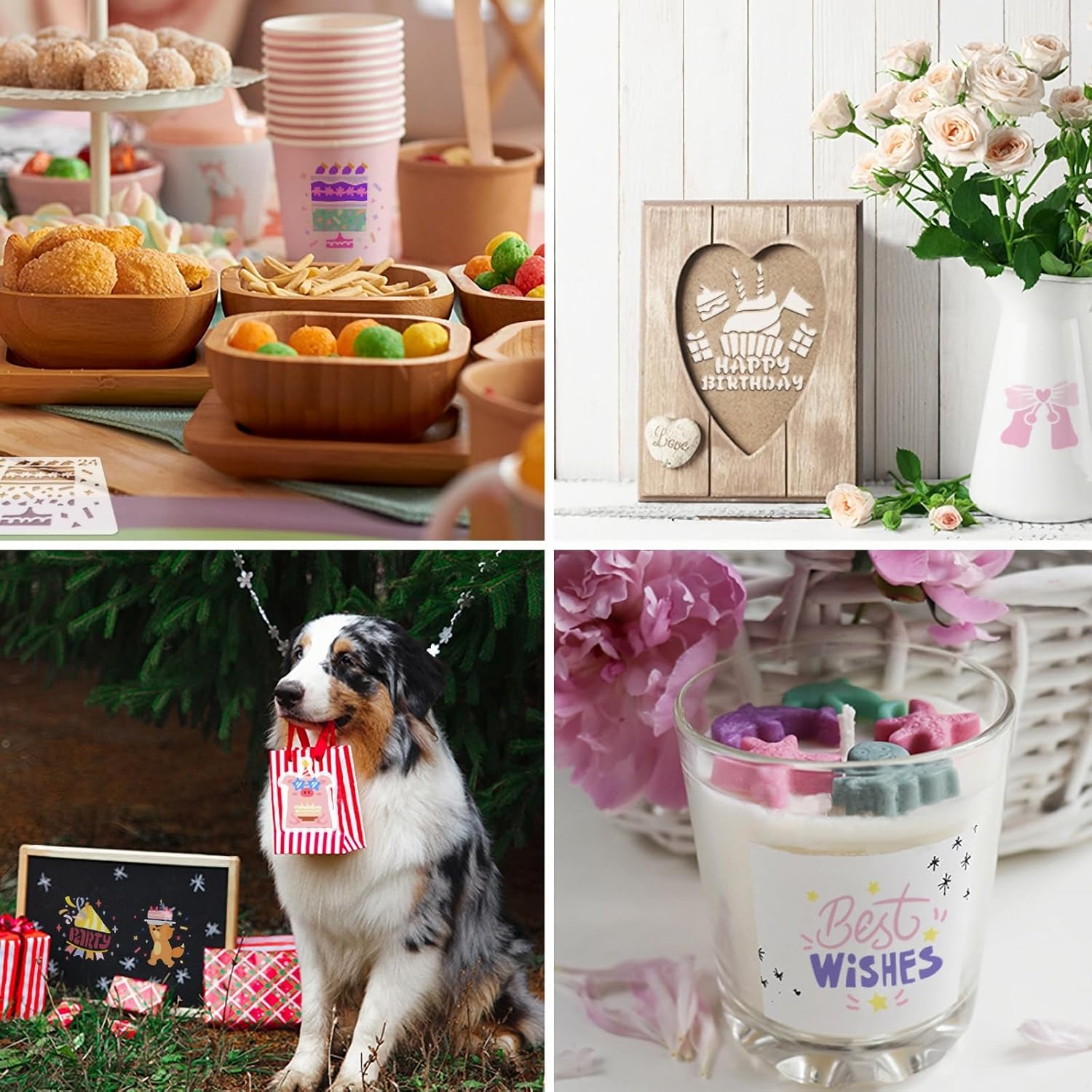 Our stencils showcase a delightful pink color scheme with soft pastels including pink, purple, and blue tones, accented with golden stars. Perfect for creating warm and sweet birthday decorations that everyone will love.