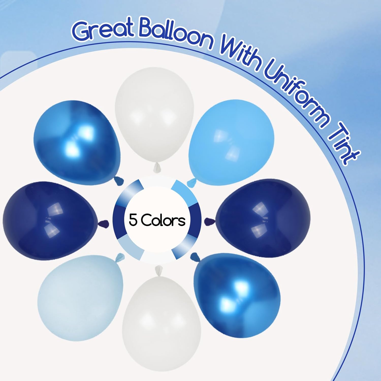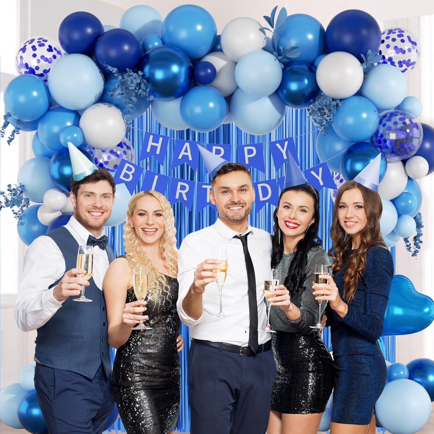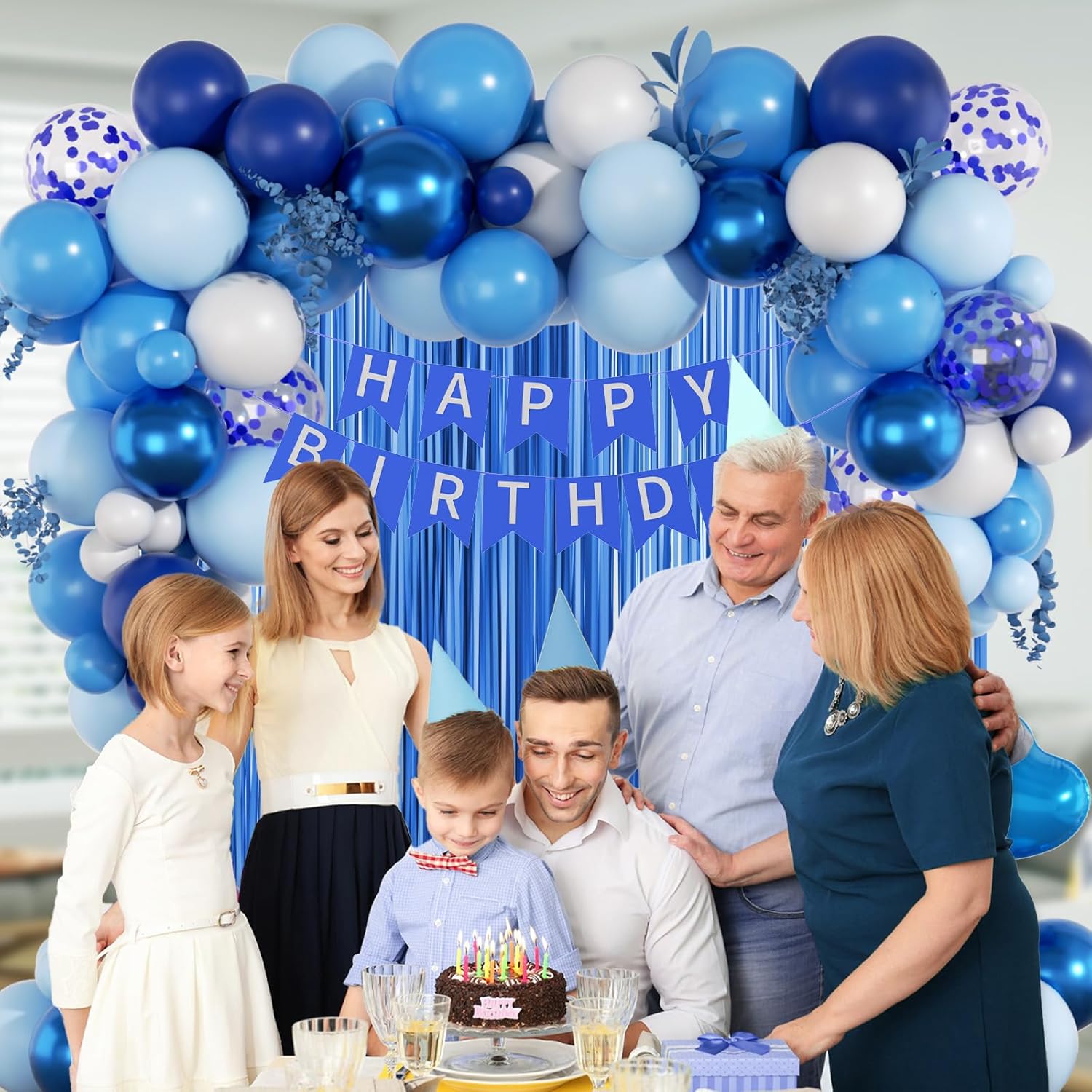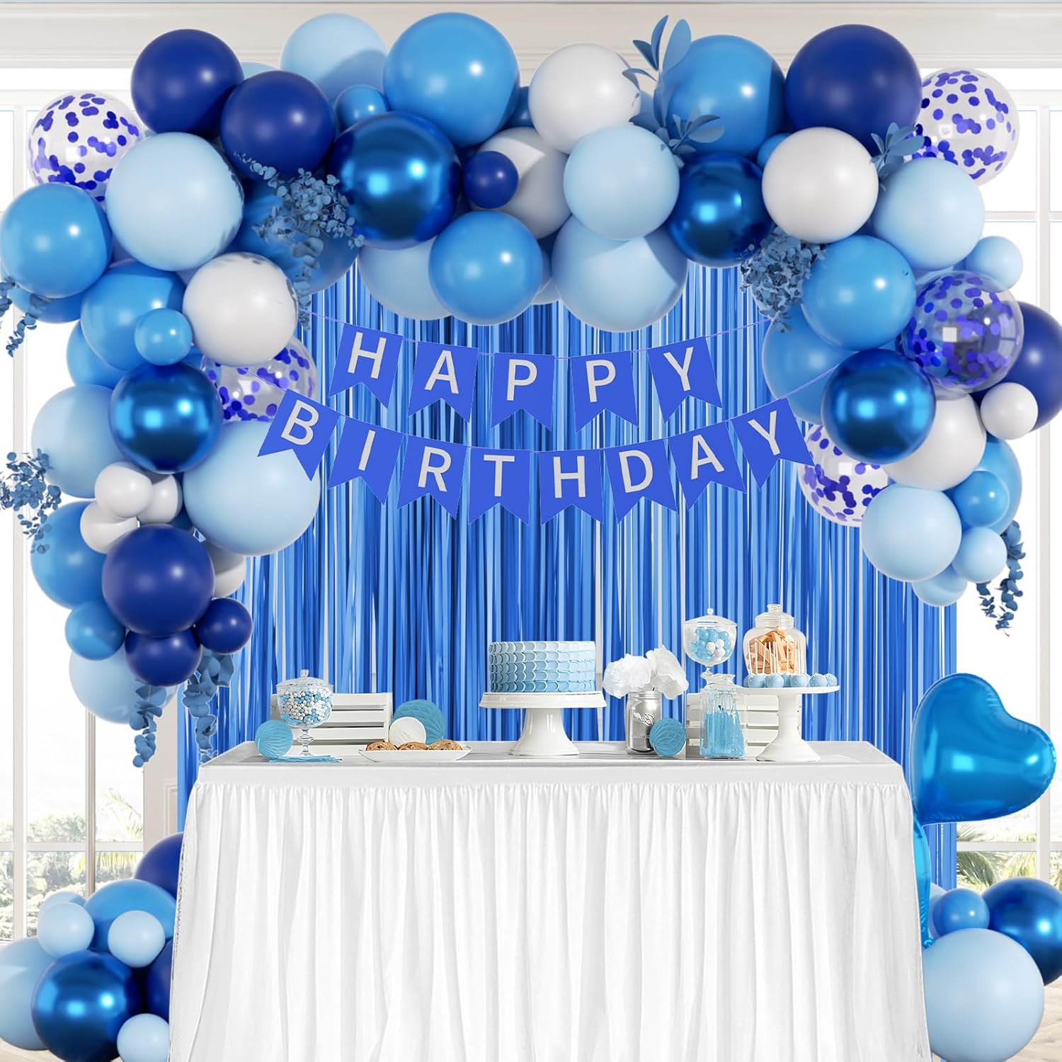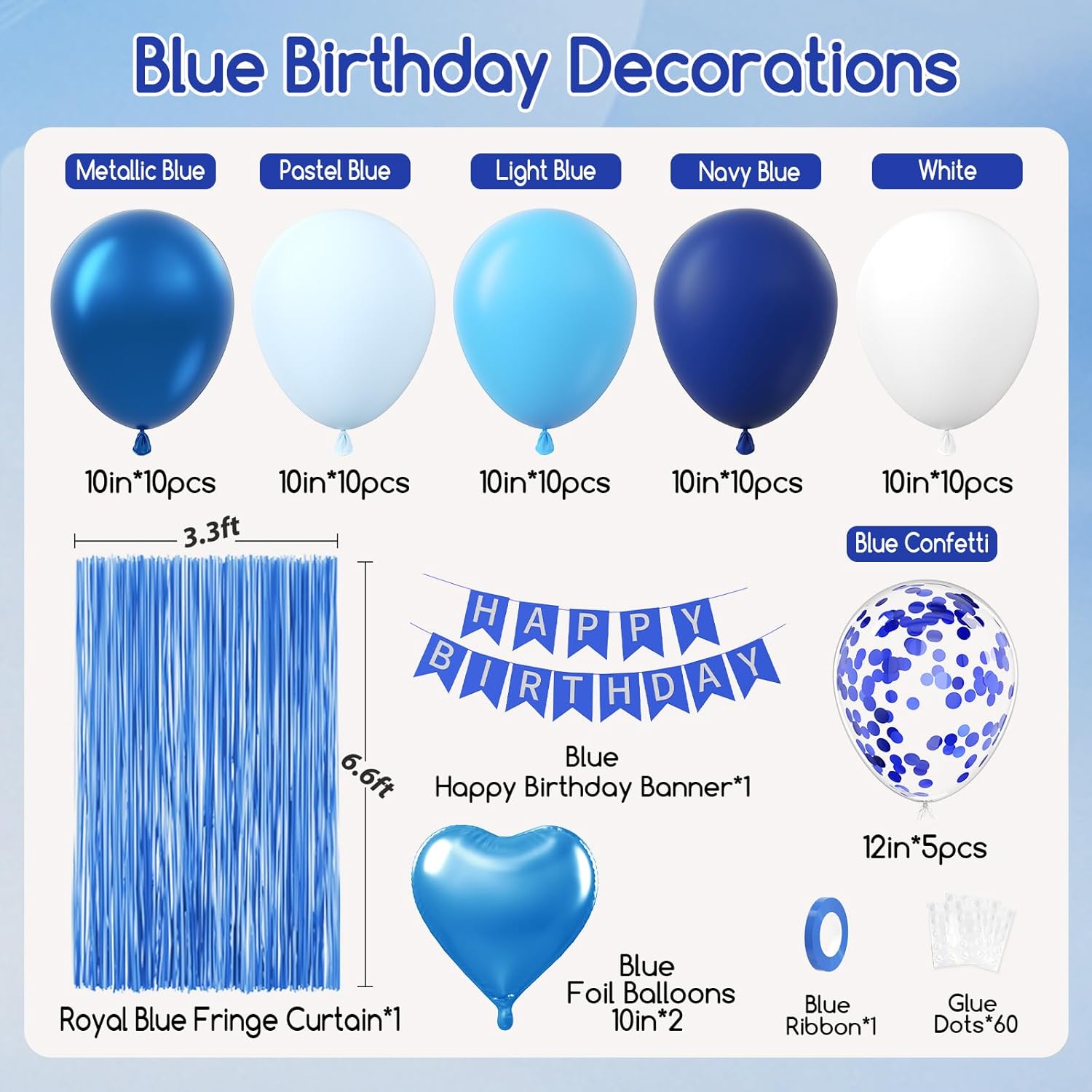 What You Will Get: The blue birthday decorations include 10inch metallic blue balloonsx10, 10inch pastel blue balloonsx10, 10inch light blue balloonsx10, 10inch navy blue balloonsx10, 10inch white balloonsx10, 12inch blue confetti balloonsx5, royal blue fringe curtainx1, blue happy birthday bannerx1, 10inch blue foil balloonsx2, blue ribbonx1, glue dotsx60