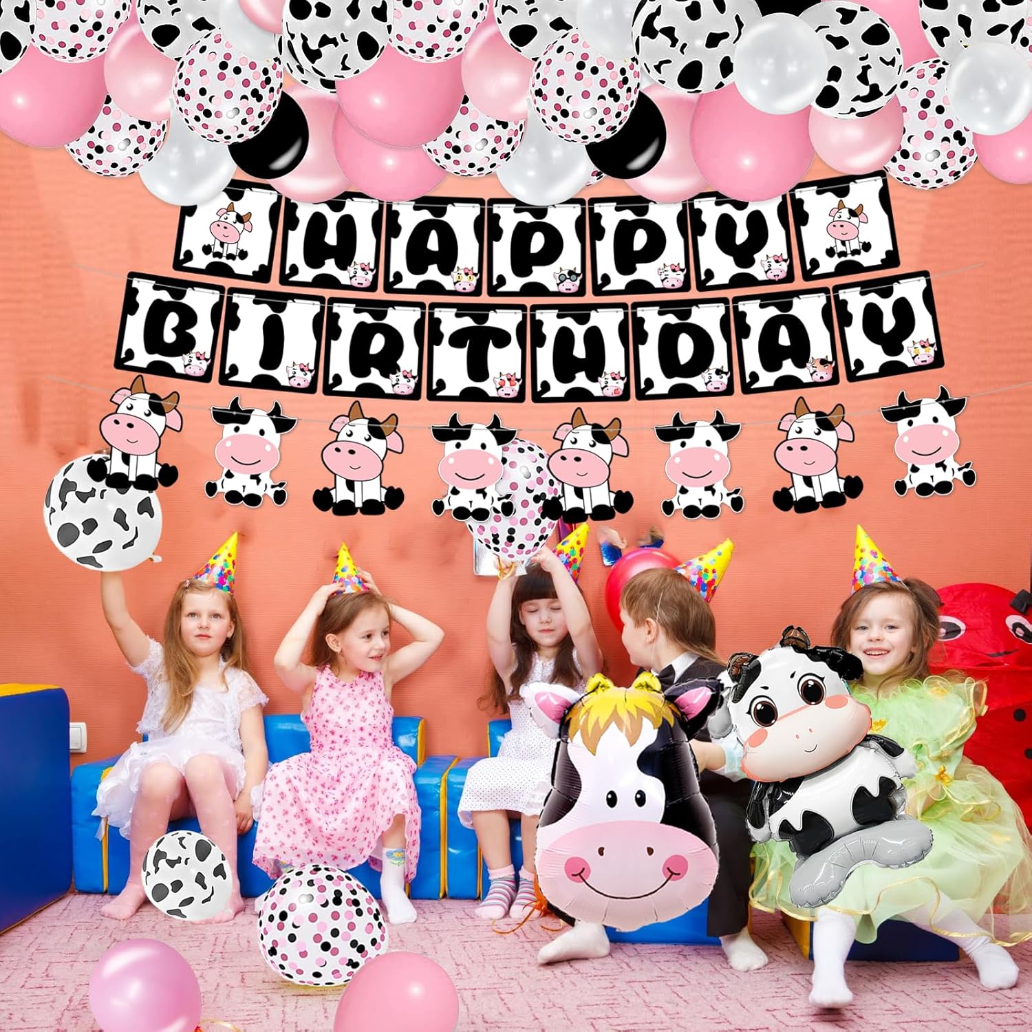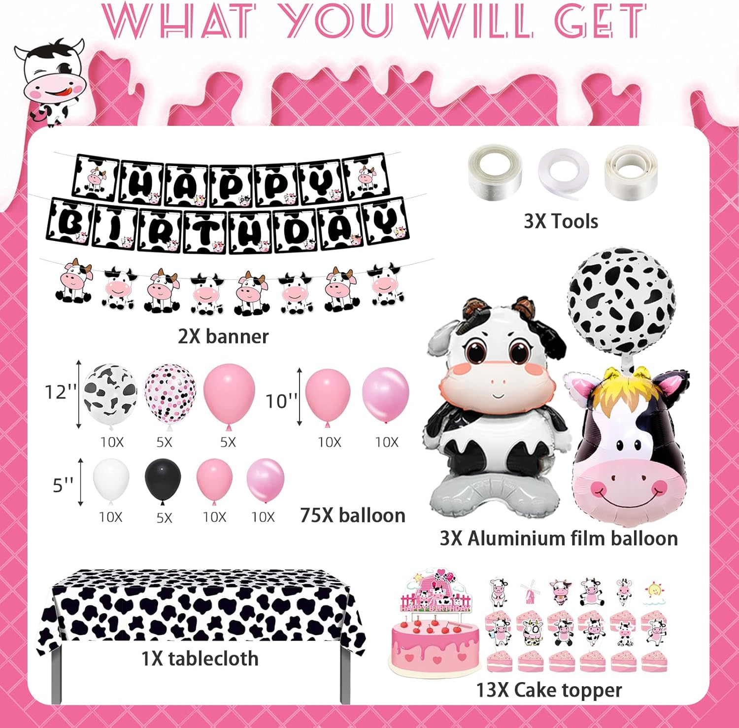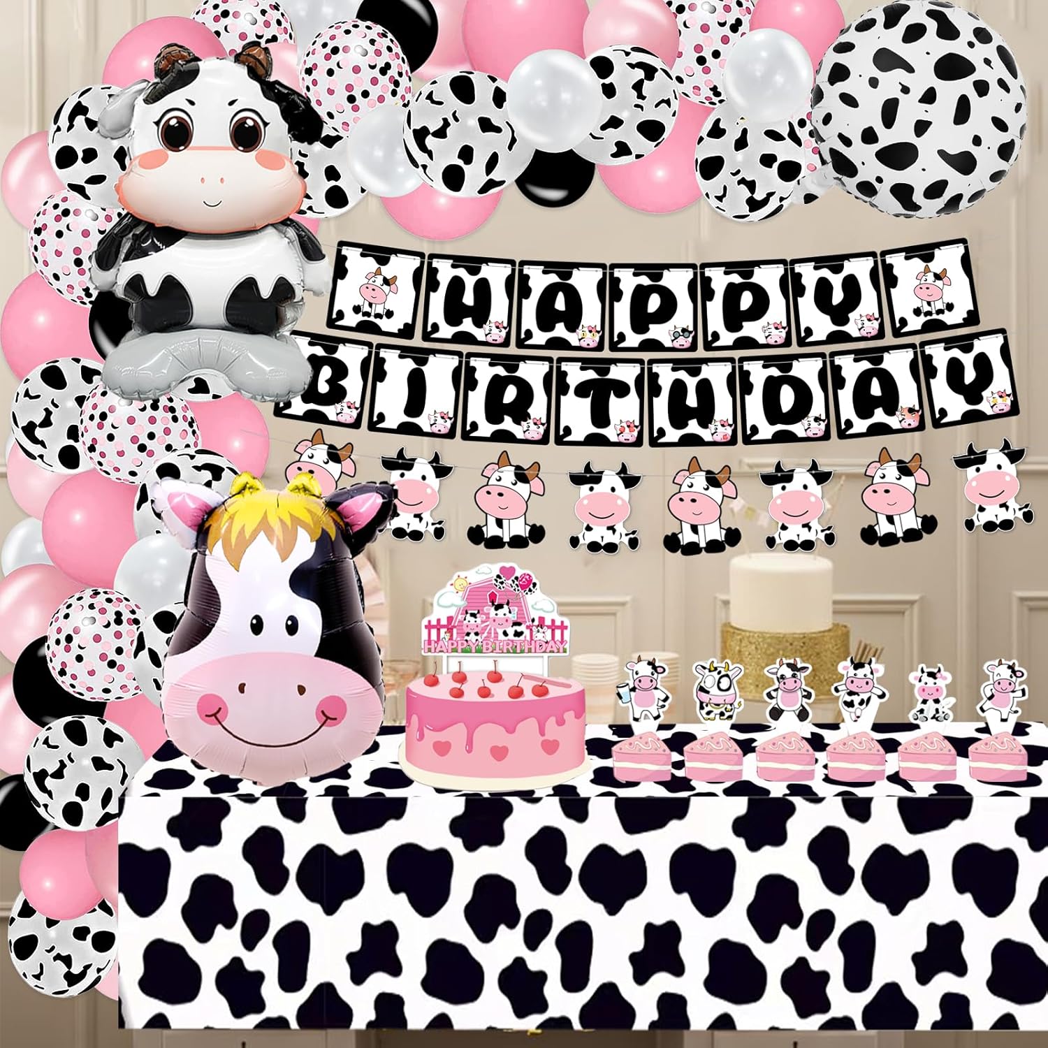 Cow Party Decorations Package List: pink cow balloon garland arch: 10 12″ cow print balloons, 5 12″ pink balloons, 5 12″ pink black confetti balloons, 20 10″ pink/ light pink balloons, 35 5″ pink/light pink/black/white balloons, 1 cow foil balloons, 1 cow head foil balloons, 1 mini cow foil balloons,1 cow print circular foil balloons, 2cow happy birthday banners, 1 cake toppers, 12 cupcake toppers, 1 tablecloth, which will meet all your needs for the cow party decorations.