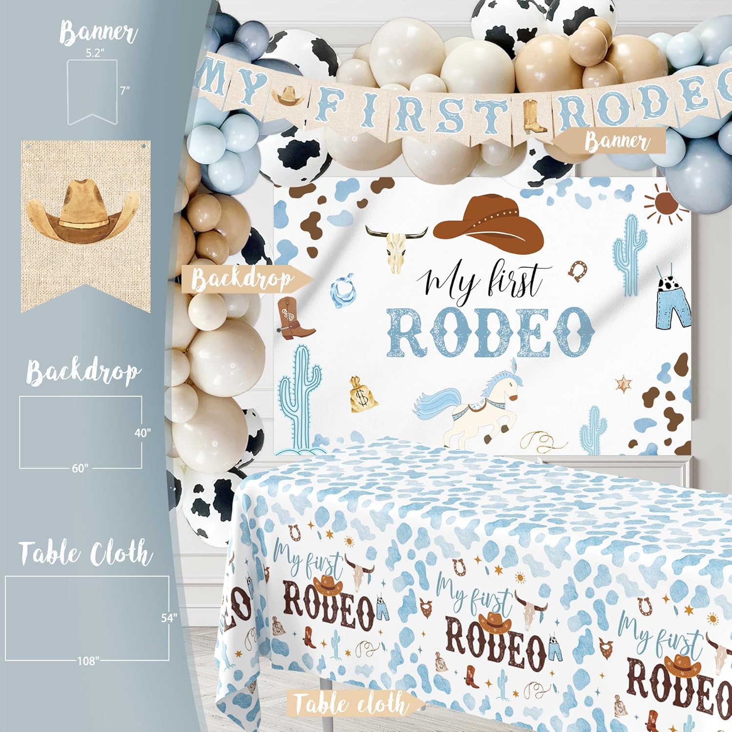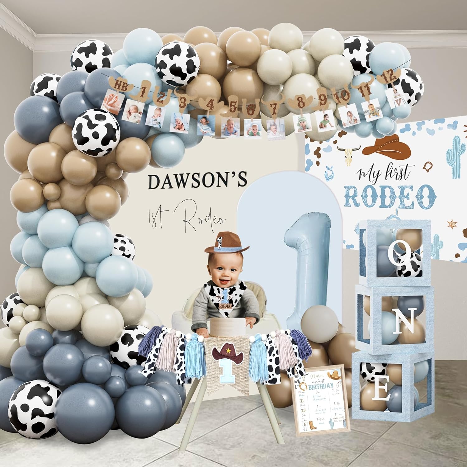 Cowboy First Birthday Decorations – Package includes: My first rodeo backdrop, my first rodeo banner, one balloon box, my first rodeo cake topper, 1st birthday high chair banner, western 1st birthday hat, western 1st birthday bandana, 1st birthday baby monthly milestone photo banner, number 1 foil balloon, 1st birthday milestone poster, my first rodeo table cloth, 113pcs balloon garland set.