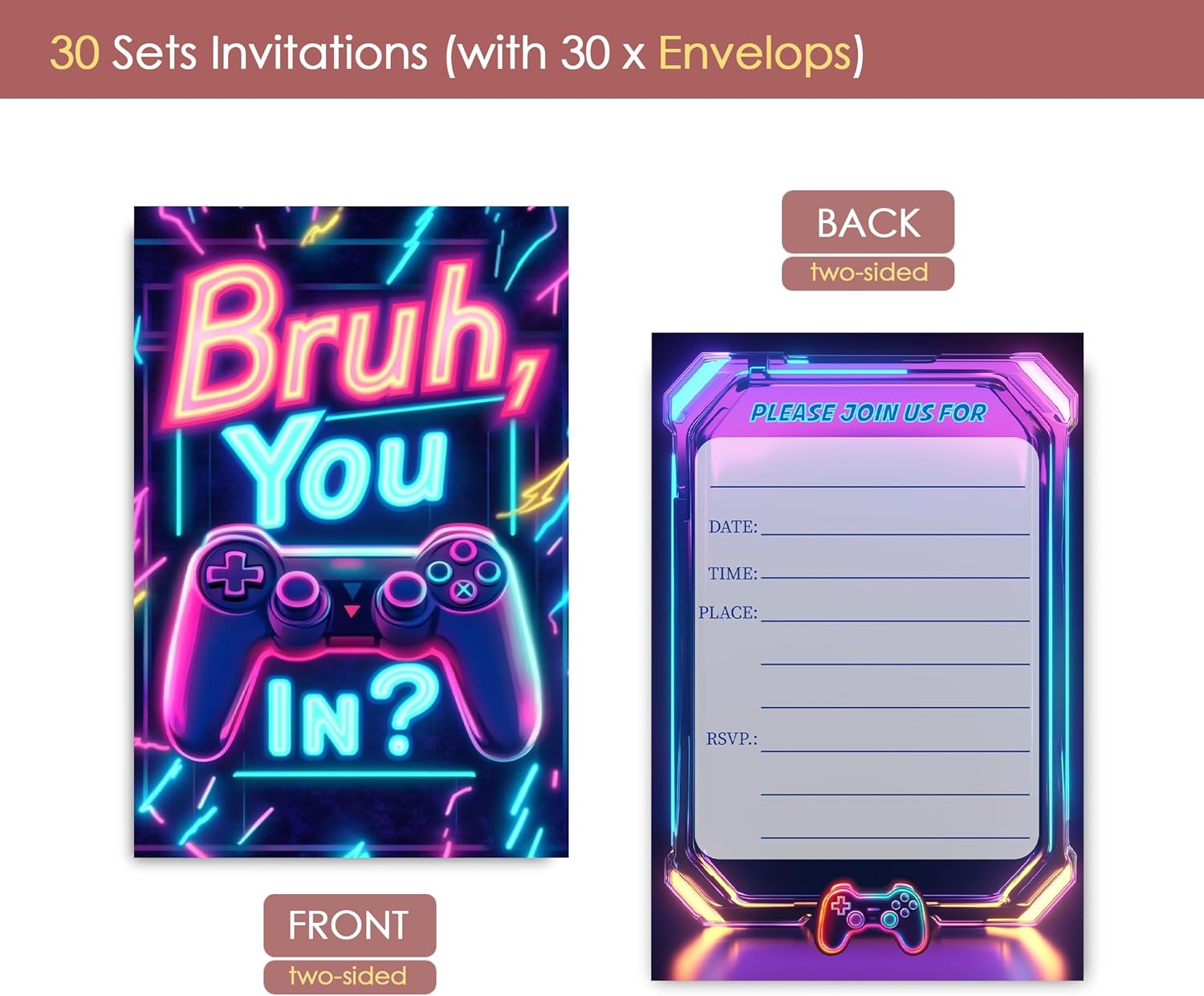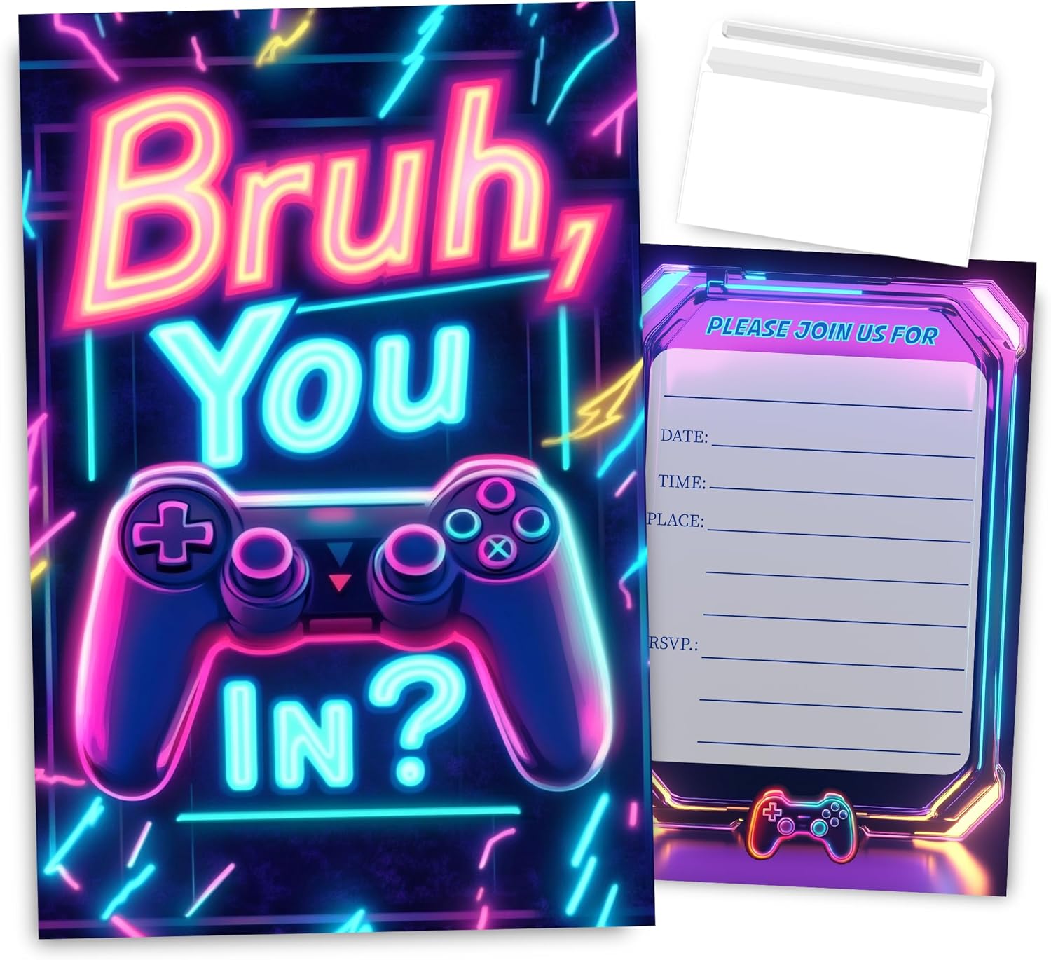Bro You in Boys Birthday Party Invitations, Neon Video Game Invites for Boys, 30 Sets with Envelopes
