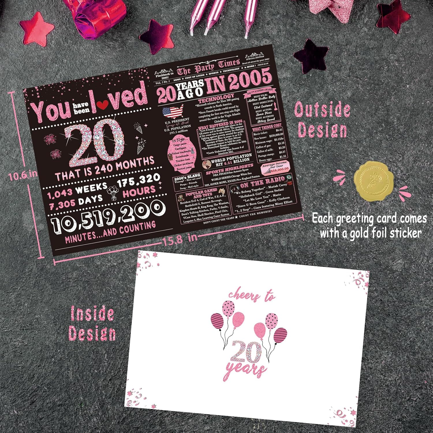 This 20th birthday card is perfect for girls, featuring a “Back in 2005” theme with rose gold accents, making her special day unforgettable.