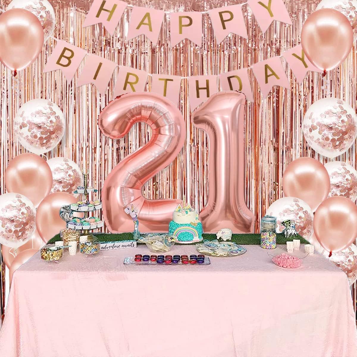 21st Birthday Decorations Set: 1 x rose gold “finally 21” sash, 1 x 21st birthday crown, 1 x happy 21st birthday cake topper, 1 x rose gold 21 number balloon (40 inch), 1 x happy birthday banner, 1 x rose gold fringe curtain (3.28 X 6.56ft), 25 x metallic rose gold balloons and 25 x rose gold confetti balloons (12 inch), 1 x inflating straw, 1 x balloon glue dot (100pcs dots in total), 2 x balloon ribbons (66ft in total), 1 x gold pin. You will organize the perfect happy 21st birthday party.