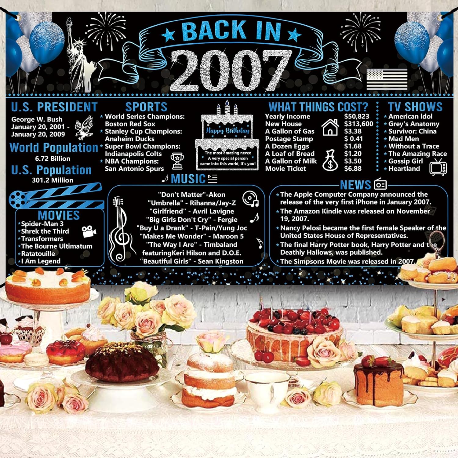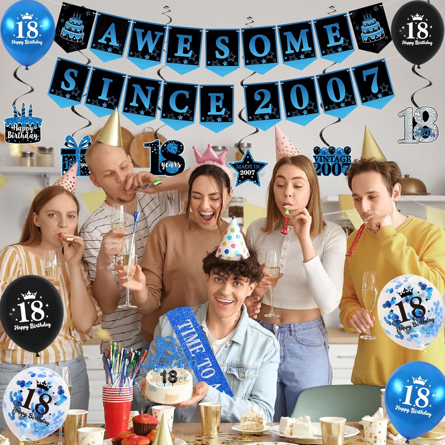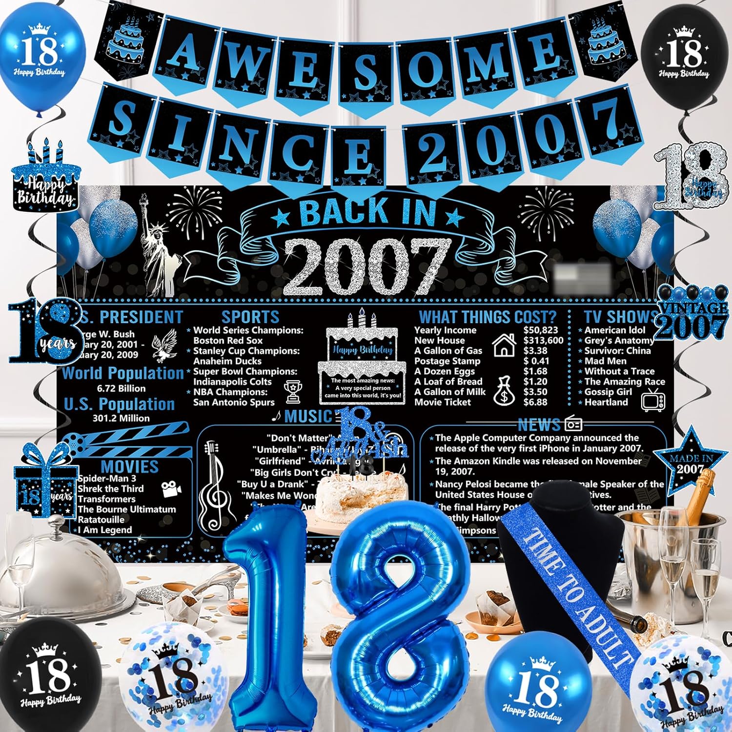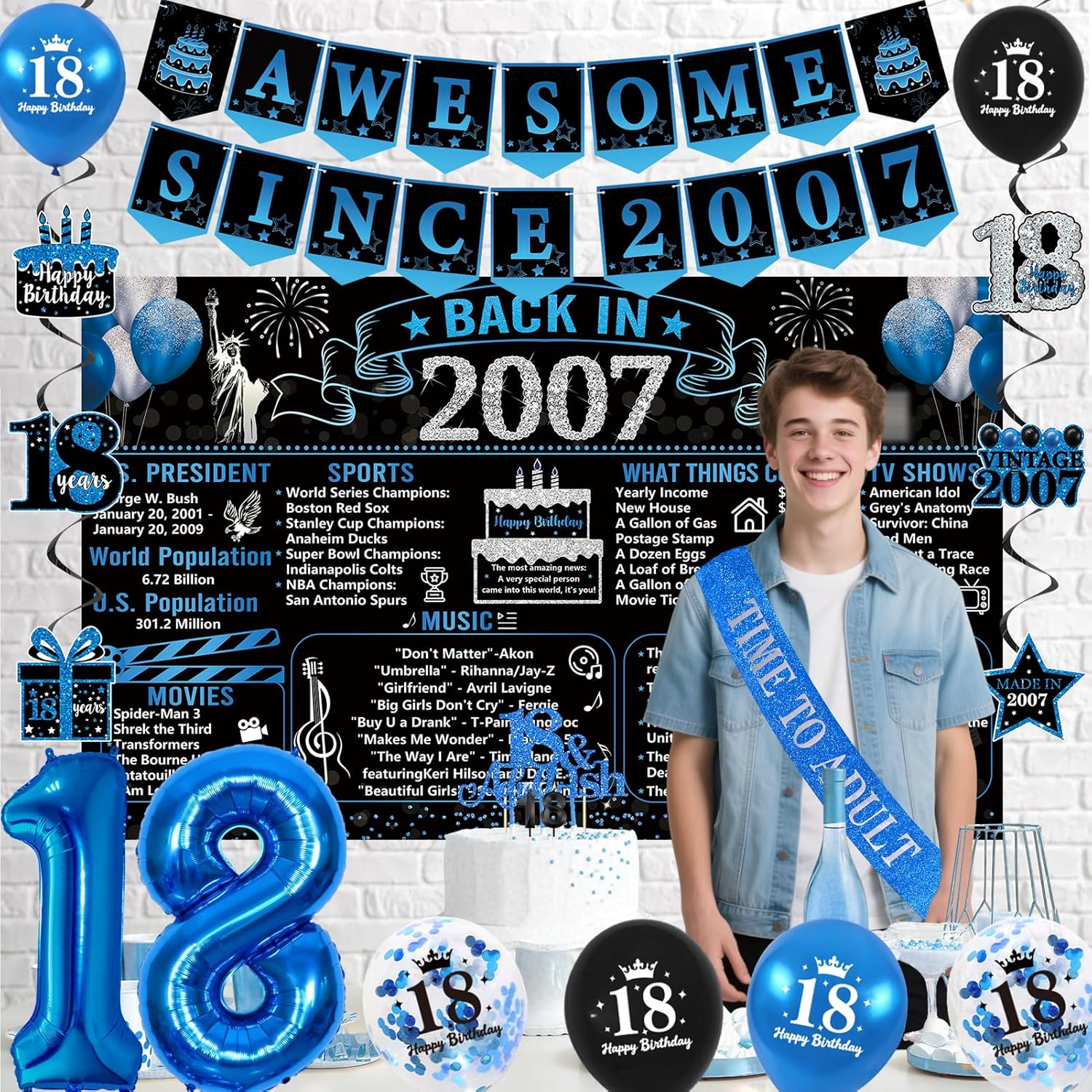 【Package includes】 You will receive a set of 18th Happy Birthday Sets, 18th Back in 2007 poster Birthday Black Blue banners, 6pcs Spiral&6pcs Balloons, 1 * “18” Candles, 1pc “Time To Adult” birthday sash, “AWESOME SINCE 2007” Banner, and a “18” Blue Aluminum Film Balloon, all of which are enough to host an impressive 18th birthday party
