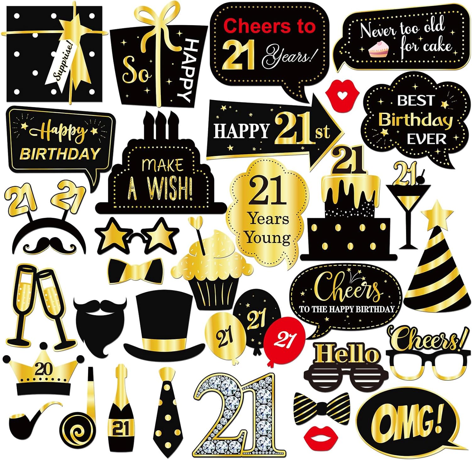 INNORU 21st Birthday Photo Booth Props, Boys Girls 21st Birthday Photoshoot Funny Birthday Party Photography Props Favor 21 Years Old Centerpiece Sticks Decorations Black & Gold 35 PCS