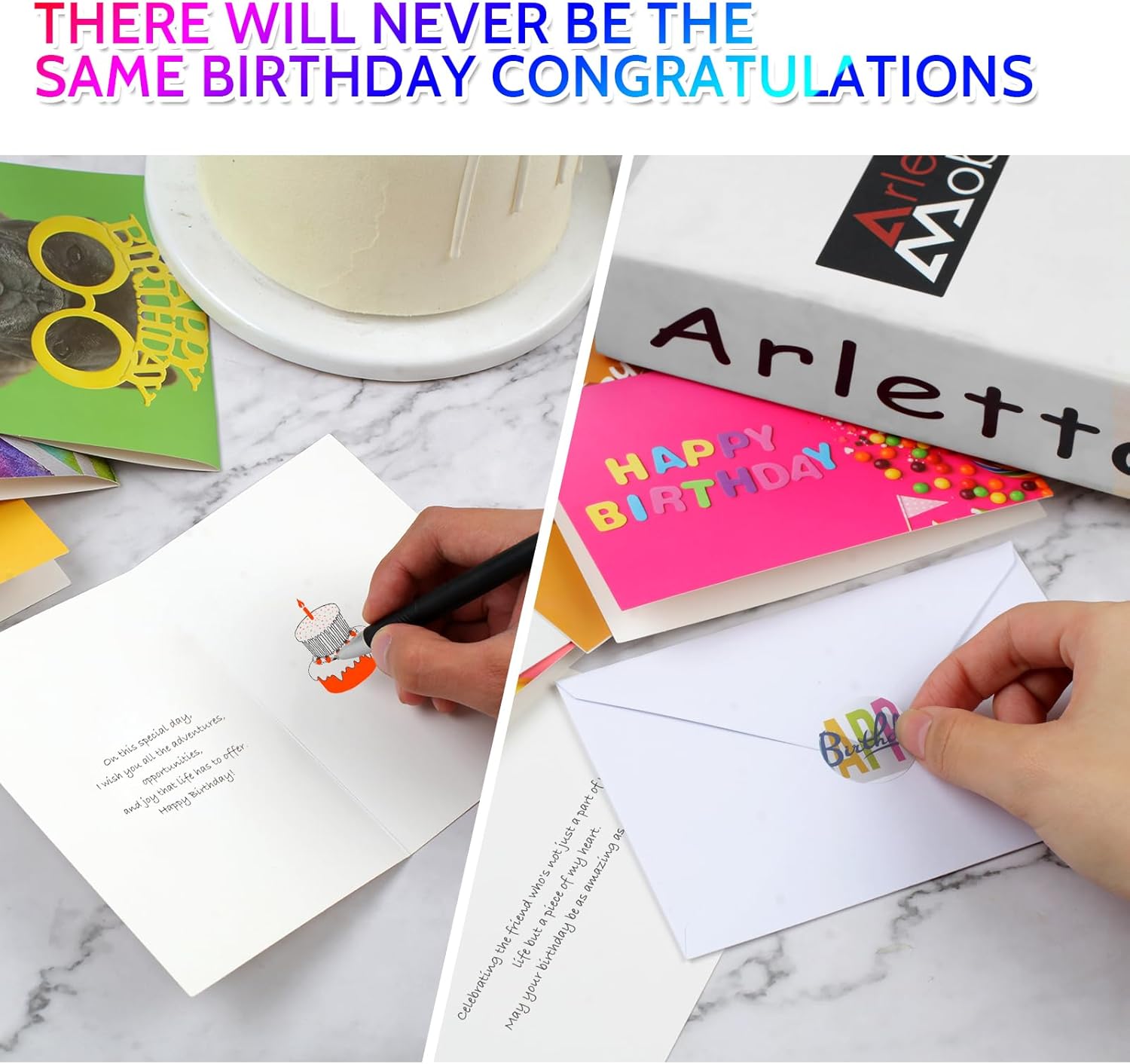 🎉CREATE QUALITY WITH HEART: Our happy birthday cards and envelopes, are 4×6 folded cardstock laminated with 250gsm single copper paper, the paper is strong and not easy to deform. The front of the happy birthday cards bulk features a beautiful birthday-themed pattern and inside has been pre-printed handwritten blessing text, each blessing is unique. The white envelopes are made from 120gsm double adhesive paper, which is not see-through and protects your message.