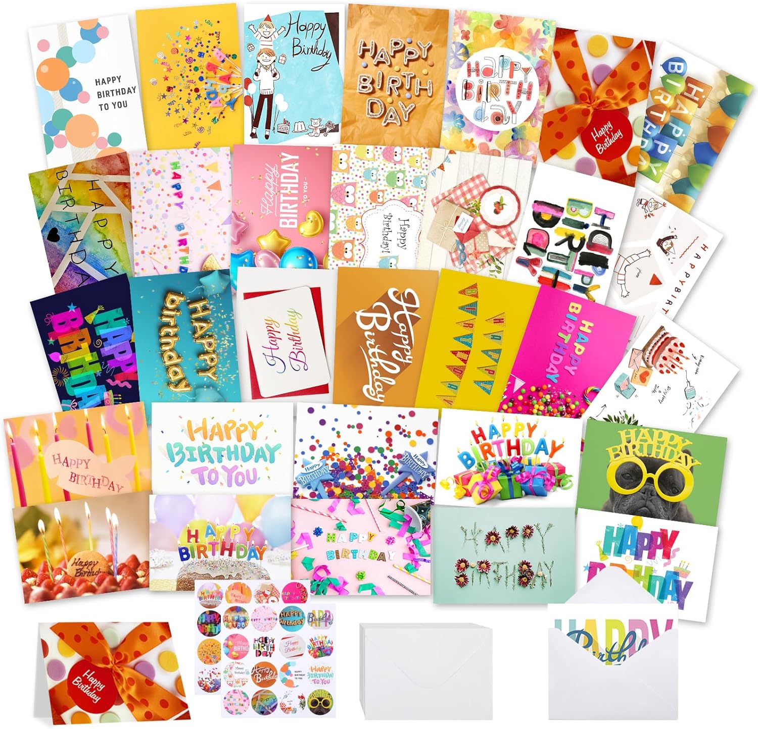 🎉32 UNIQUE SETS OF HAPPY BIRTHDAY CARDS AND ENVELOPES: 32 beautiful birthday cards are 4 “x 6” in size, paired with 32 white self-sealing 4.2 “x 6.2” envelopes and 32 polka dot stickers in different patterns with a diameter of 1.2in, no additional sealing tape required, enough to meet your daily use. Happy Birthday cards bulk is unrolled by default, and the fold marks of the cardstock are pre-printed, so you don’t have to worry about being unable to fit the cardstock into the envelope due to improper folding.