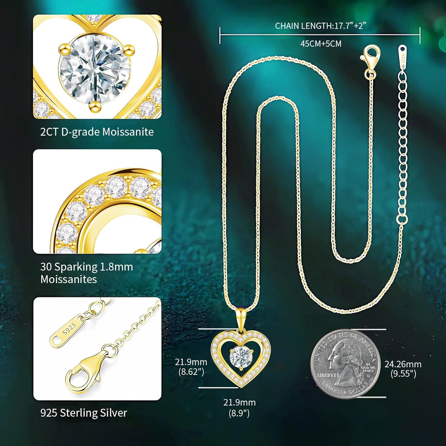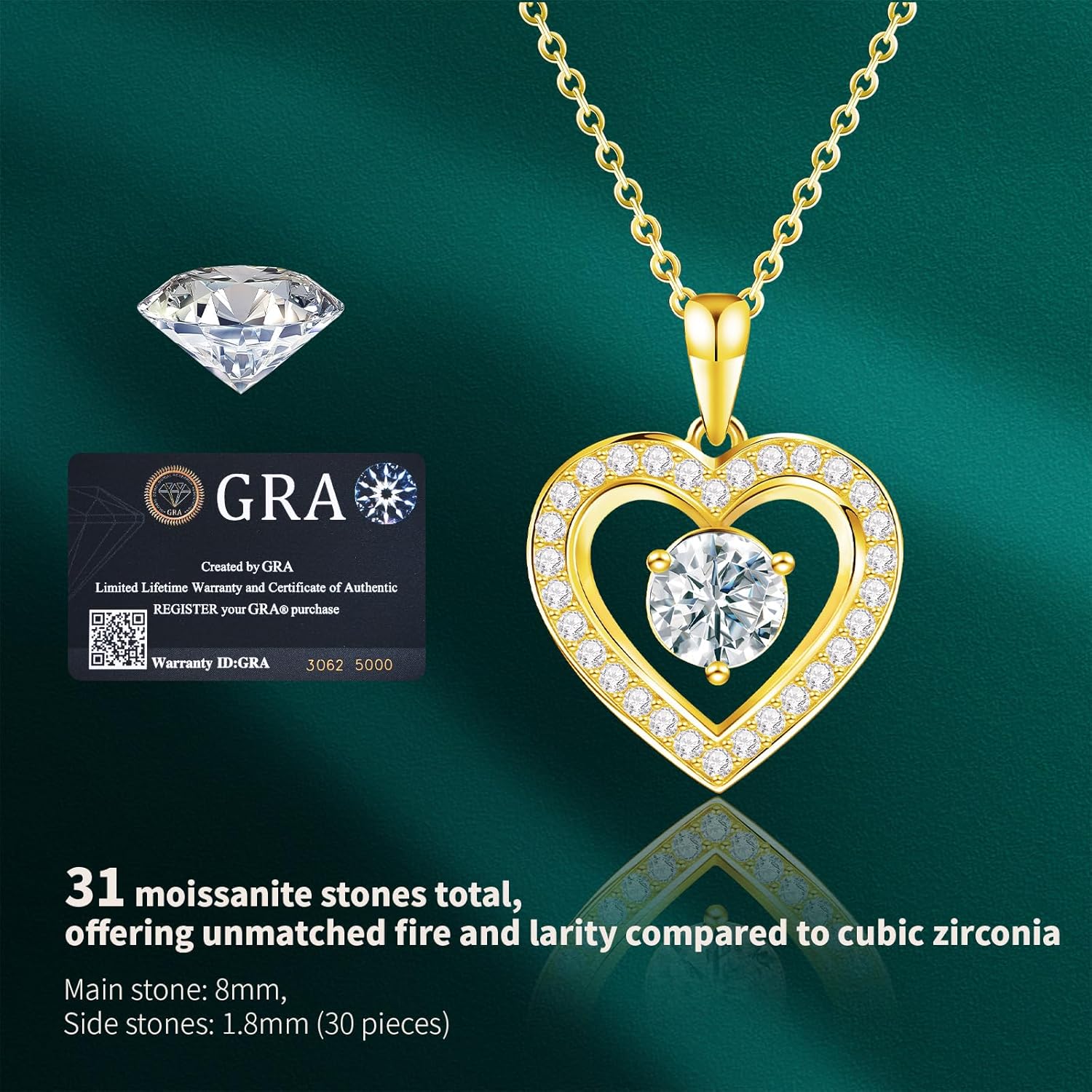 Full Moissanite Heart Necklace – No CZ! 2ct Vibrant Birthstone & 30 White Gems | 12 Month Gifts for Wife, Mom, Her | Anniversary, Valentine’s Day, Mother’s Day Jewelry