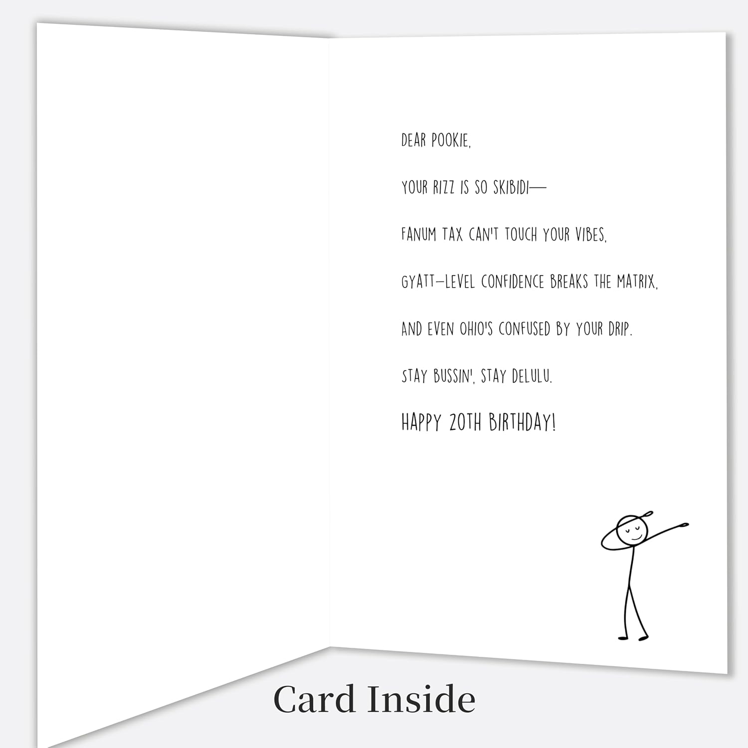 Funny 20th Birthday Card:Celebrate their Gen Z vibe: Packed with trending slang like “Pookie,” “Bussin,” and “Skibbidy Rizz,”instantly recognized by Gen Z! This 20th birthday card speaks directly to boys or girls, blending hilarious meme humor with heartfelt birthday wishes. Perfect for making 20th feel seen and hyped on their big day!