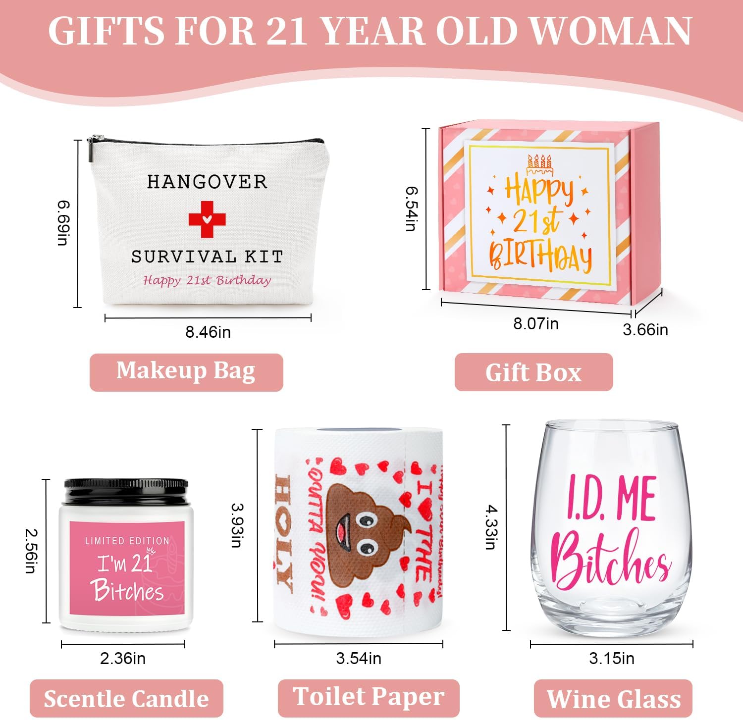 Happy 21st Birthday Gifts for Her: Our 21st birthday gift basket is a perfect and practical gift for 21st birthday female, the girls 21st birthday gift ideas contains the most popular 1* 15 oz 21st birthday wine glass, 1* funny and cute toilet paper, 1* 21st birthday candle, 1* hangover survival kit makeup bag, 1* gift box, it’s a very meaningful 21st birthday gift for daughter, woman, friend, best friend, sister, colleague to make them feel unforgettable. This 21st birthday ideas will surely bring her fun and surprise!