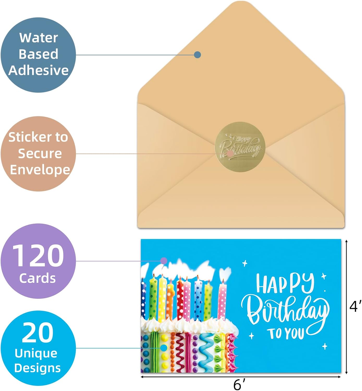Birthday Cards Bulk with Short Generic Message Inside, 20 Unique Designs