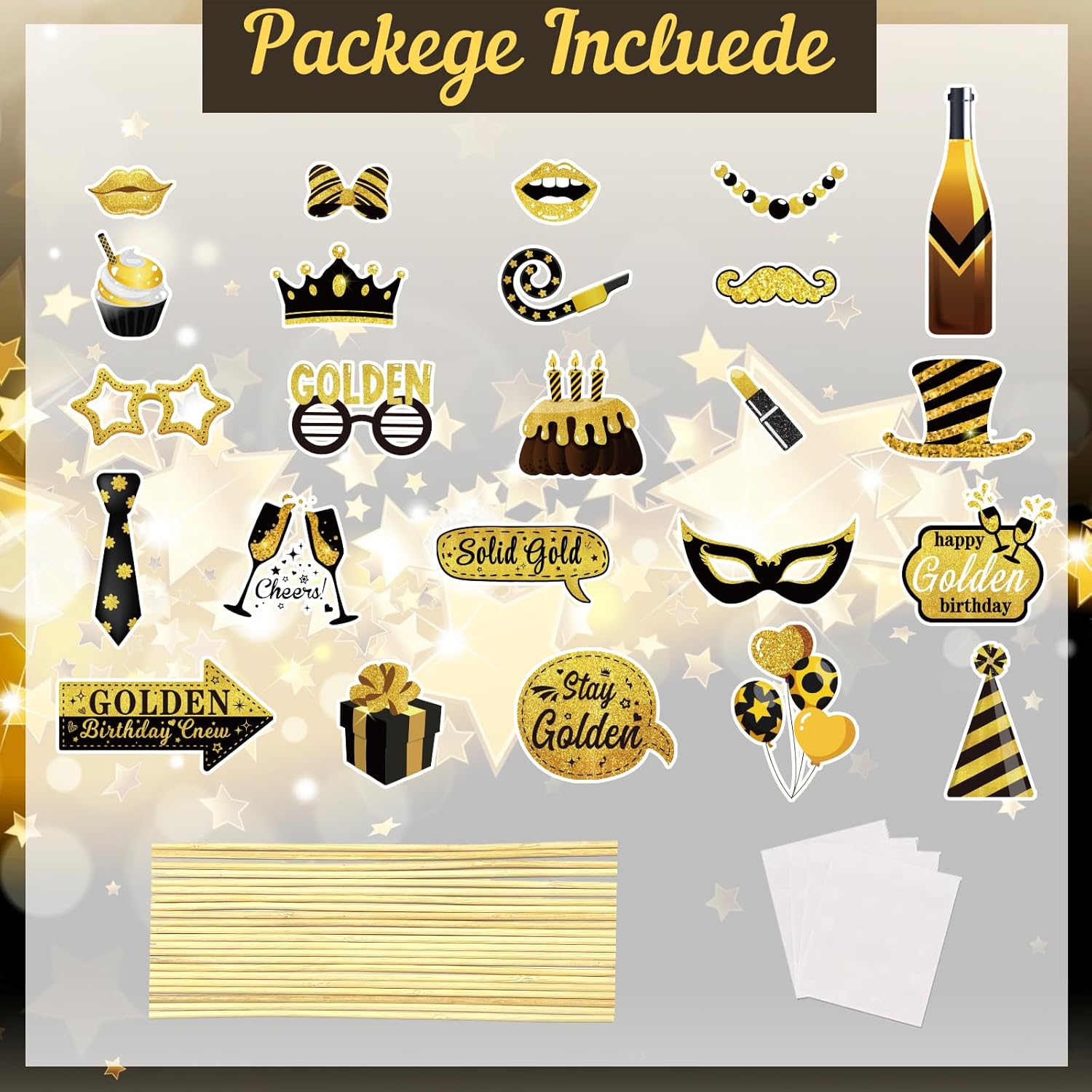 It’s My Golden Birthday Party Supplies: You will get black gold golden birthday photo booth props set mix comes with 24 different stylish and funny patterns props, such as crown, glasses, mask, golden logo, and so on. Enough quantity and rich styles to meet your need