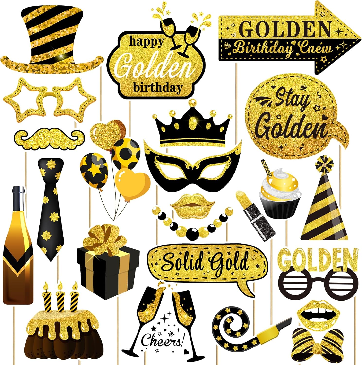 24 Pcs Black Gold Themed Golden Birthday Party Photo Booth Props Set