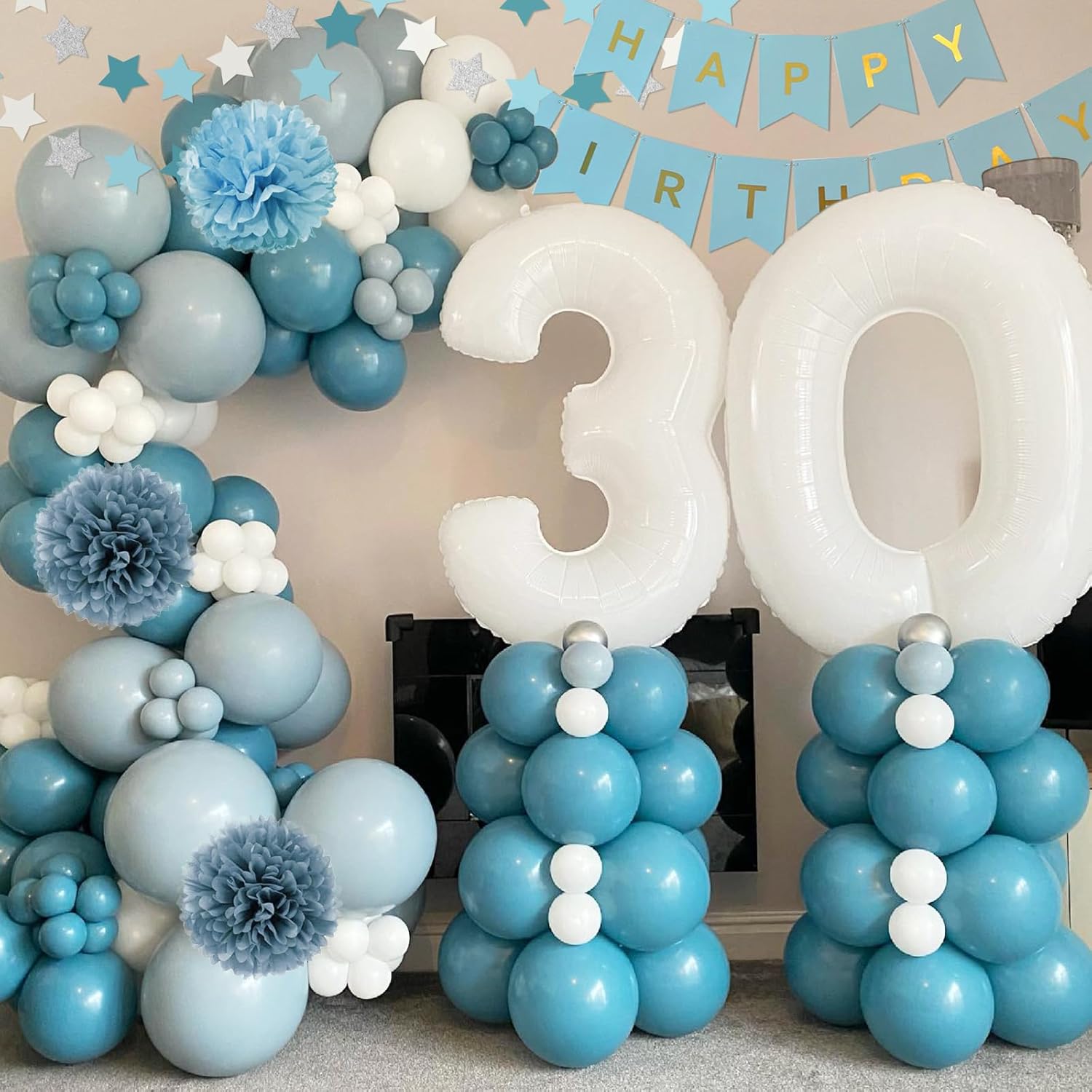 Blue Birthday Decorations: Birthday decoration set includes: 43 birthday balloons (blue, gold, sequins, ivory); happy birthday sign * 1; star banner * 1; Star balloons * 2; Paper pompoms * 8; Blue Fringe Curtains * 1; Cake decorations, ribbons, balloon chains
