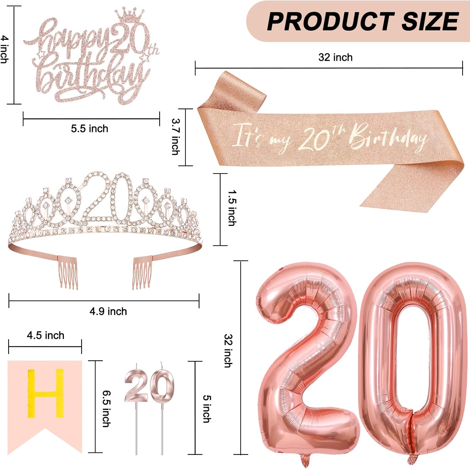 20th Birthday Decoration Set:Our set comes in a rose gold theme, including a sparkling 20th birthday crown *1, “It’s my 20 Birthday” sash *1, 20th happy birthday cake topper *1, 1+0 birthday candles *1 set, 1+0 birthday balloons *1 set, and a happy birthday banner *1. All products are neatly arranged in a paper box.