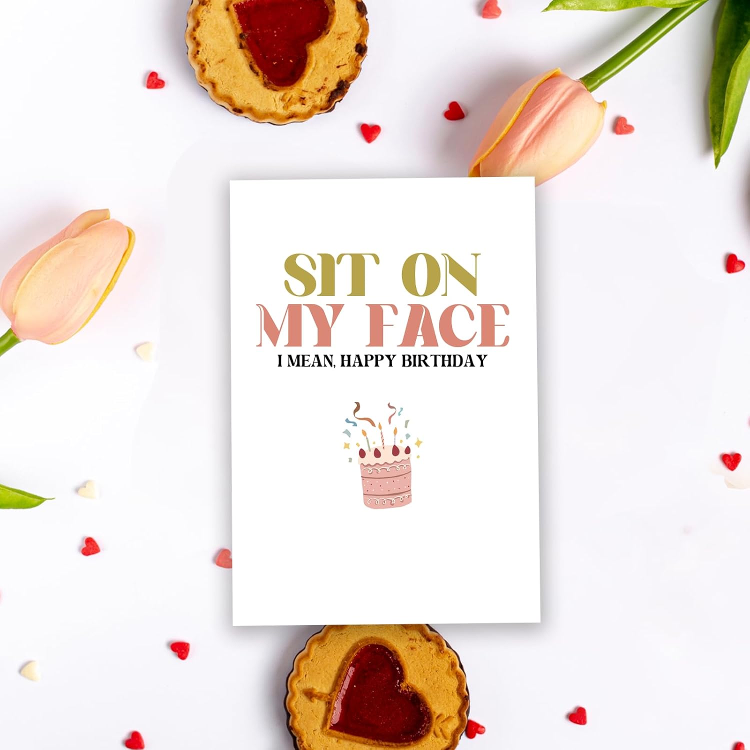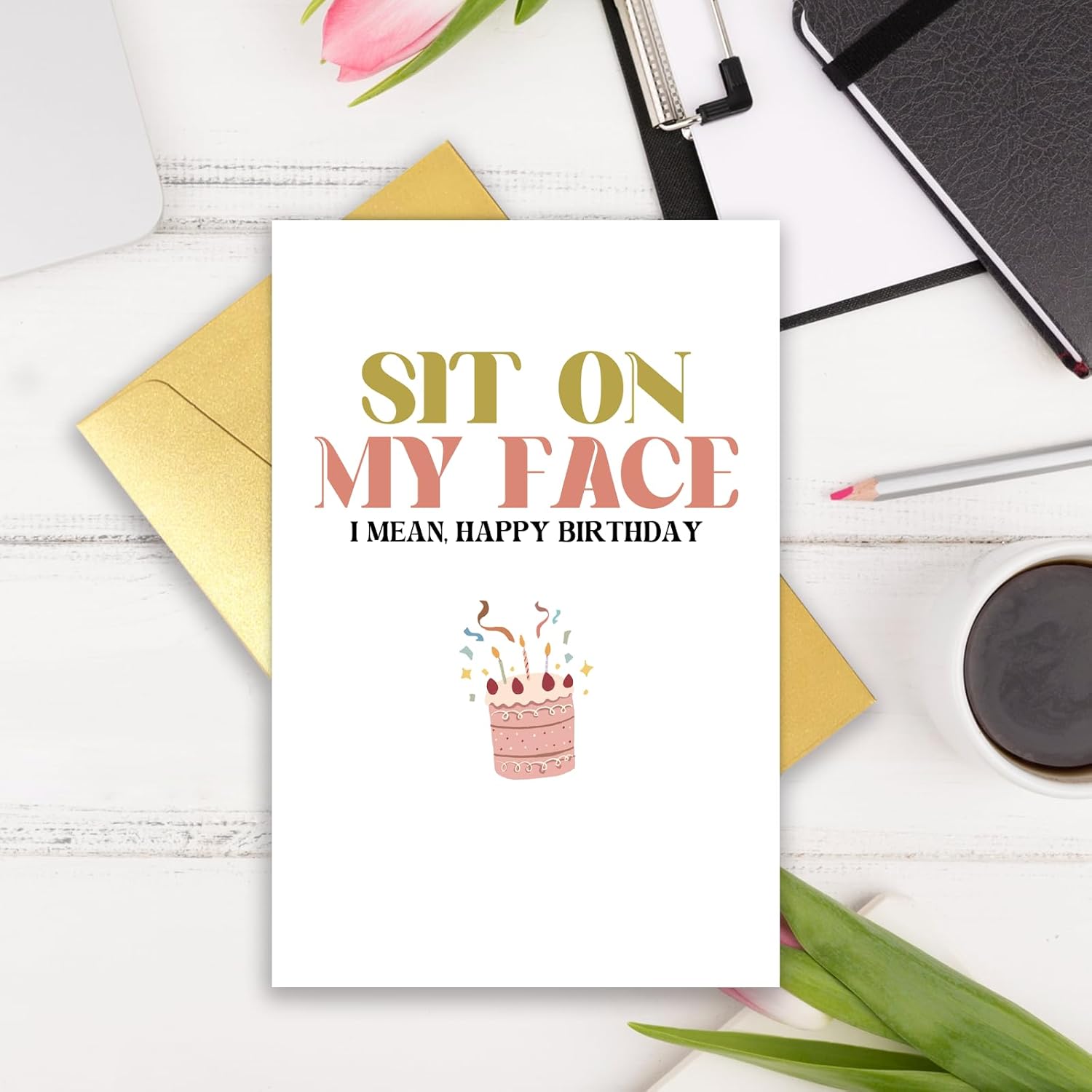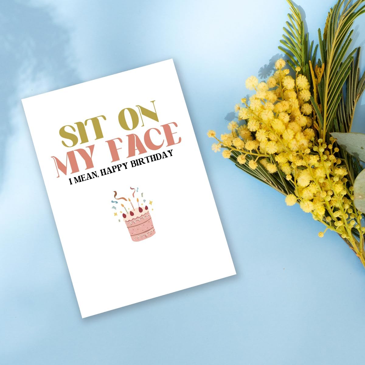 Naughty birthday card for wife girlfriend: A naughty birthday gift for her. Featuring a cheeky caption that reads, “Sit on my face, I mean Happy Birthday,” this card is the ultimate choice for those who appreciate playful and risqué humor.