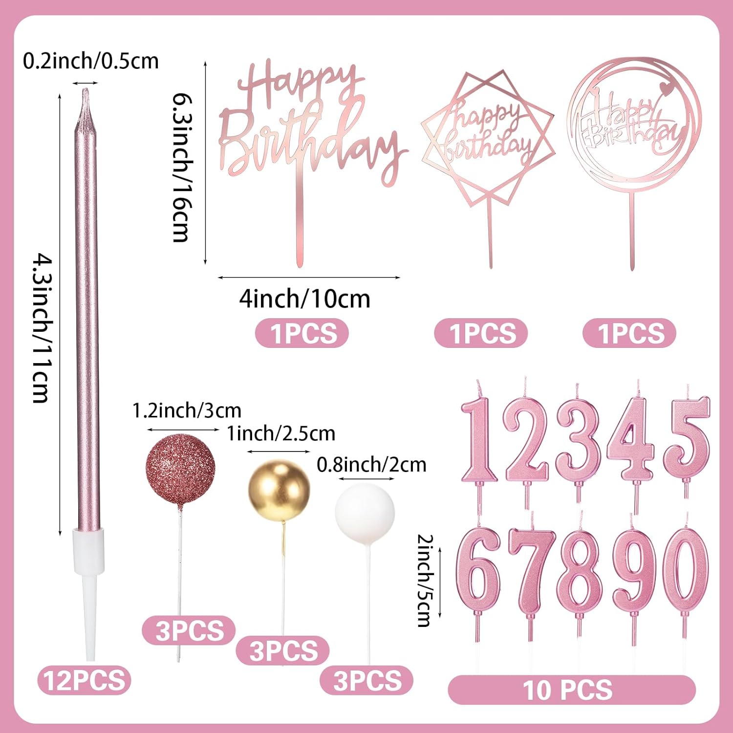 Size Information: acrylic happy birthday cake toppers are about 16 x 10 cm/ 6.3 x 4 inches, long thin cake candles measure about 11 x 0.5 cm/ 4.3 x 0.2 inches, ball cake toppers are about 2 cm/ 0.8 inches, 2.5 cm/ 1 inches, 3 cm/ 1.2 inches, number candles measure 5 cm/ 2 inches in height; Our happy birthday cake toppers candles will look gorgeous on your cake
