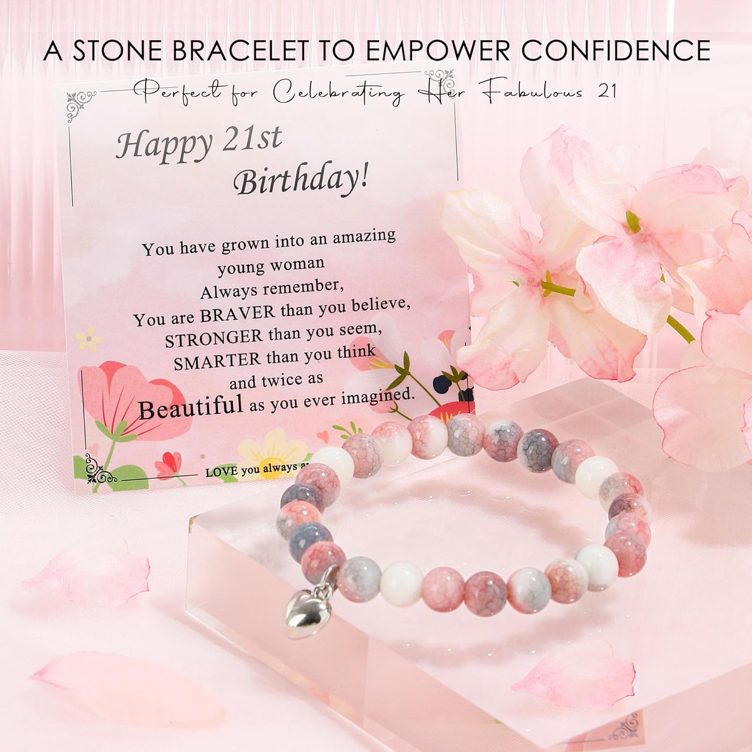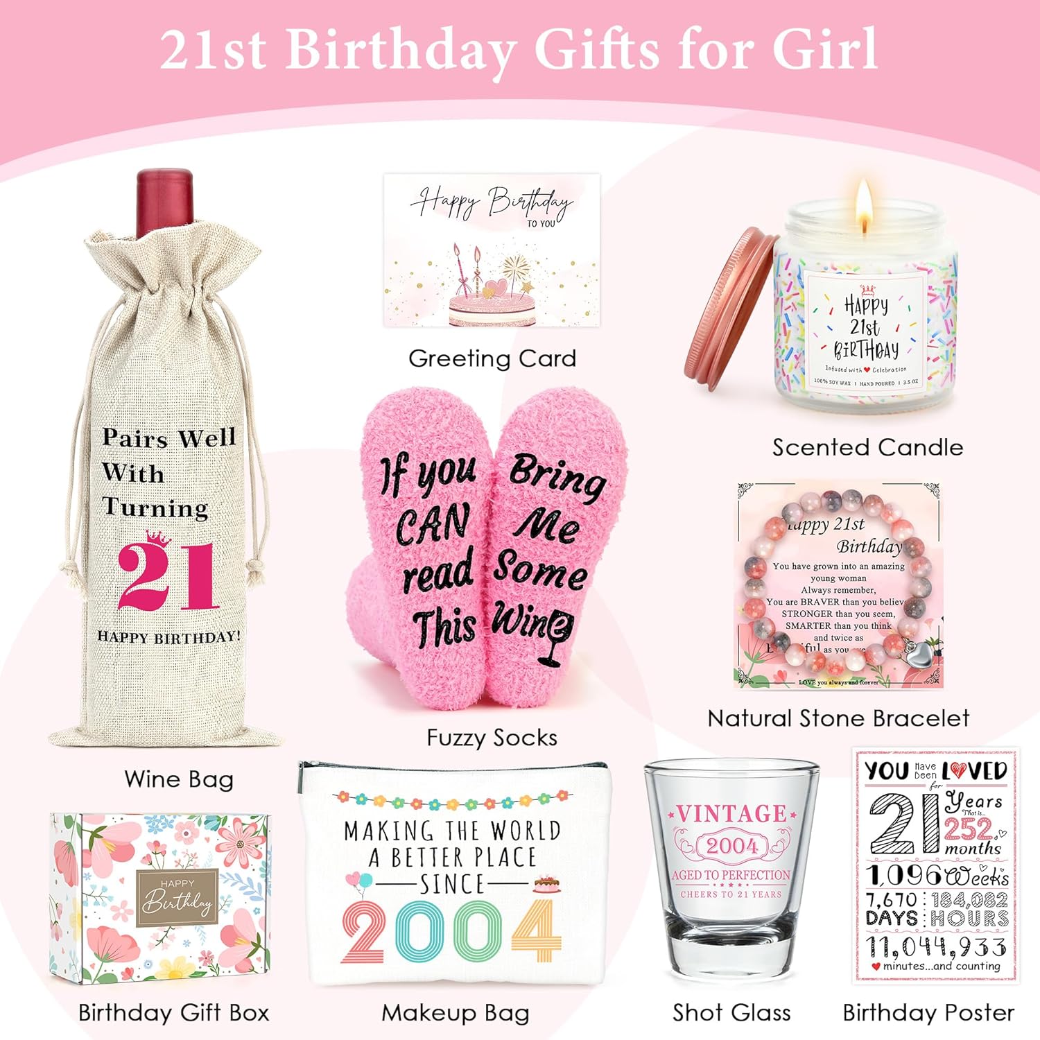 9Pcs 21st Birthday Gift Ideas: This cool 21st birthday gift for young women includes 9 pieces carefully selected items: 1* 21st birthday cup, 1* natural stone bracelet, 1* 21st birthday decoration poster, 1* 21st birthday gift bag, 1* birthday socks, 1* 21st birthday candle, 1* wine bag, 1* birthday card, and 1* elegant gift box.