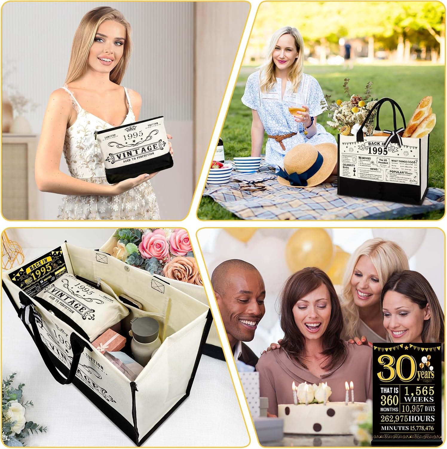30th Birthday Gifts for Women Canvas Tote Bag Travel Gear, Unique 30 Years Old Birthday Gifts for Mom Wife Aunt Friends Her, Vintage 1995 Handbag & Cosmetic Bag & Back in 1995 Poster