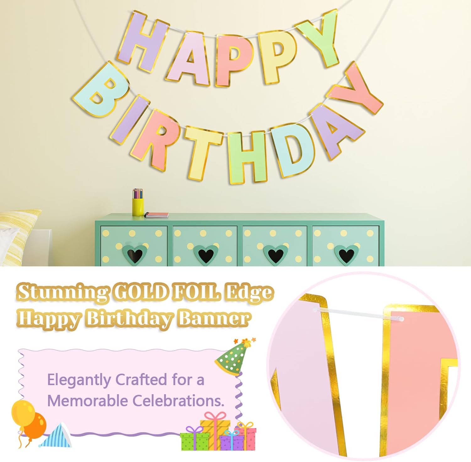 Delicate and Luxe: Each happy birthday banner is meticulously crafted with gold foil finish on the edges, adding a trendy and luxurious touch to your birthday decor