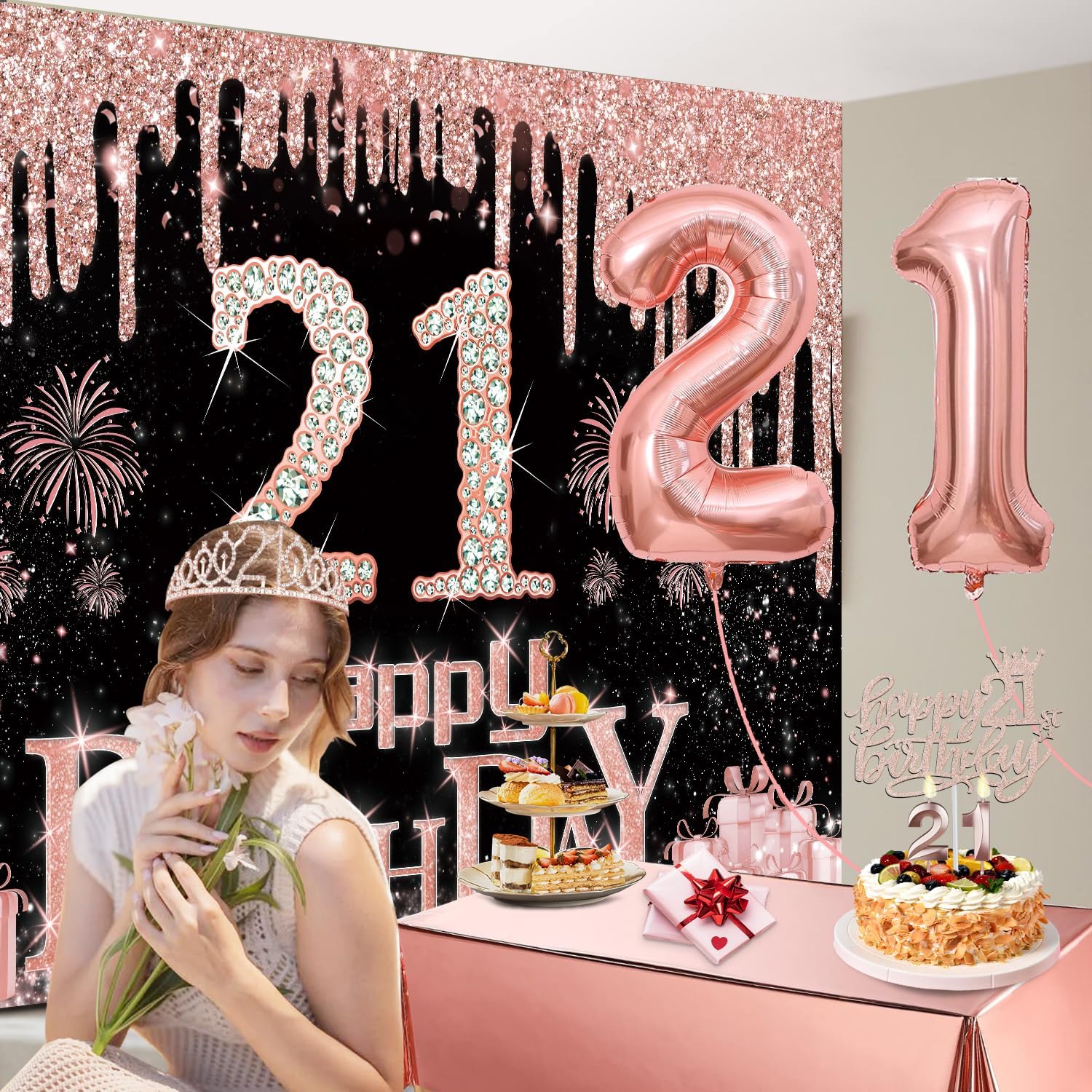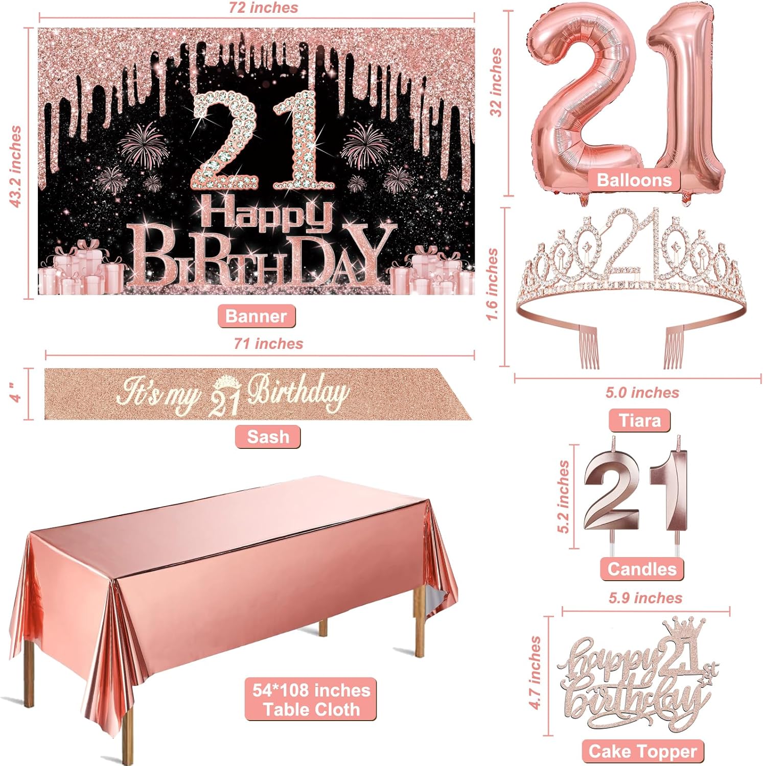 21st Birthday Decorations: Package coming with 21st Birthday Banner *1pc, 21st Birthday Tiara *1pc, 21st Birthday Sash *1pc, Happy 21st Birthday Cake Topper *1pc, 21st Birthday Candles *1set, 21st Birthday Balloons *1set, Rose Gold Tablecloth *1pc. The rose gold 21st birthday party decoration pack is the best way to meet different decorating needs; the all-in-one kit is perfect for creating an elegant and dreamy 21st birthday