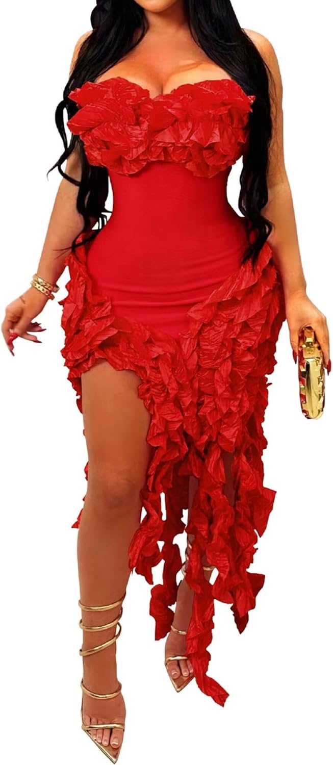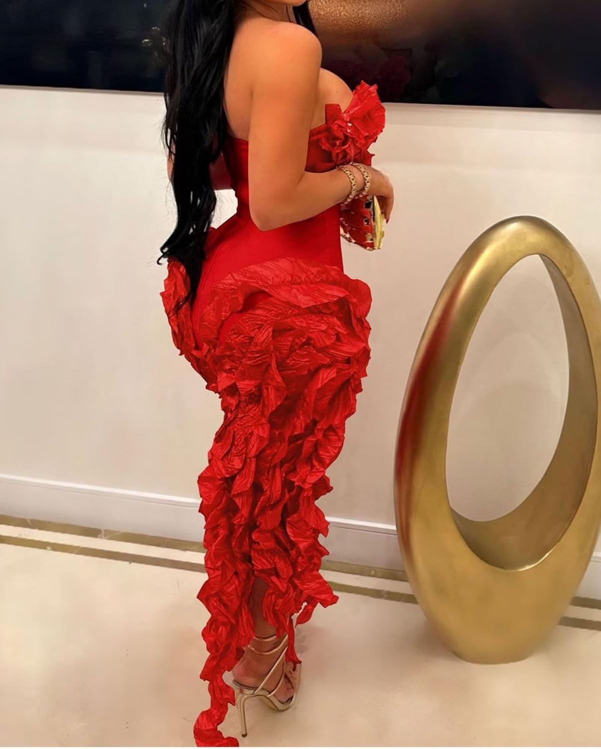 Womens Strapless Tube Asymmetrical Ruffle Maxi Bodycon DressWomens Strapless Tube Asymmetrical Ruffle Maxi Bodycon Dress