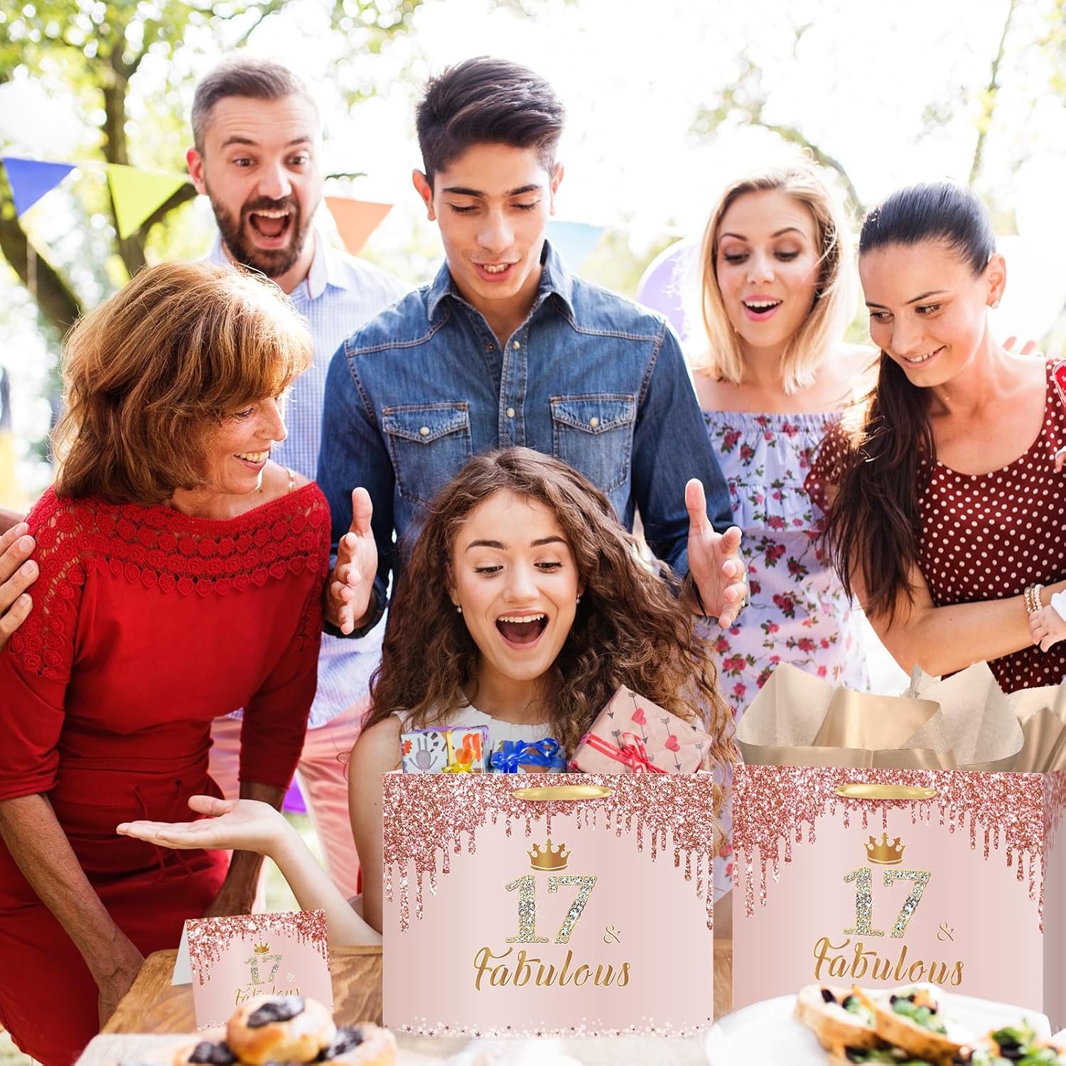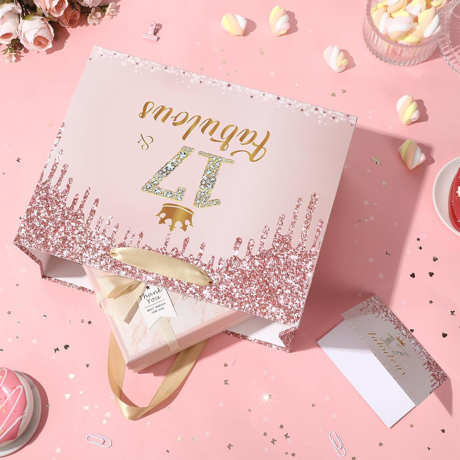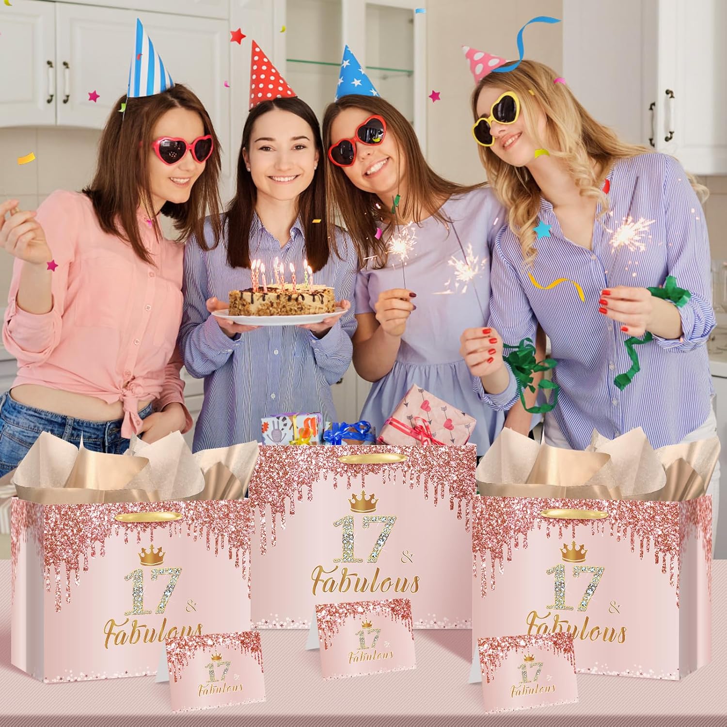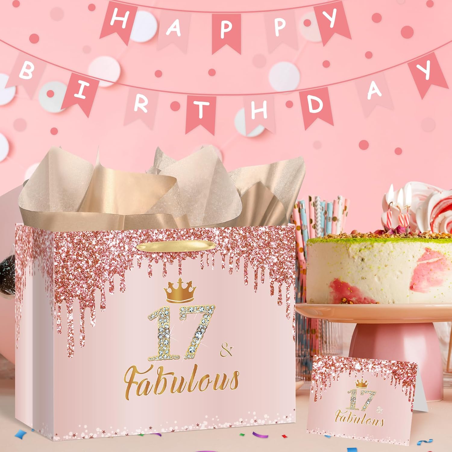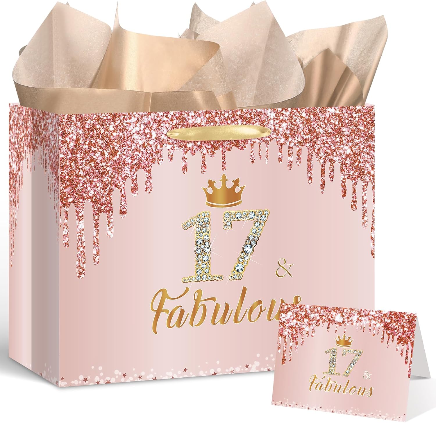 🎁【Package List】You will get a large rose gold 17 & fabulous birthday gift bag for girls, a 17 & fabulous birthday greeting card and 3 pieces of 17th birthday wrapping tissue paper.