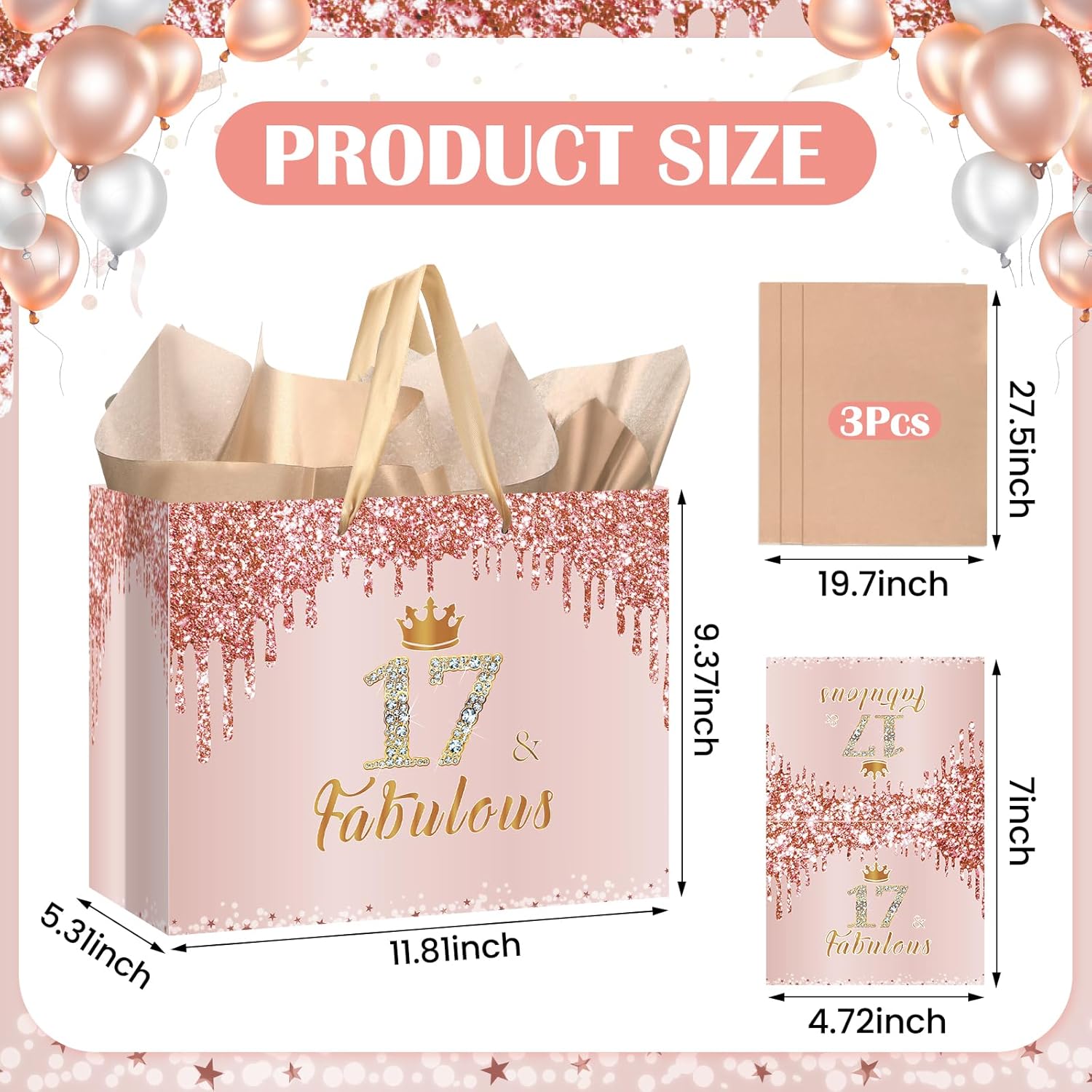 🎁【17 & Fabulous Birthday Gift Bag】The rose gold 17th birthday gift bag for girls comes in rose gold, gold and silver, which features glitter rose gold prints and 17 & Fabulous.