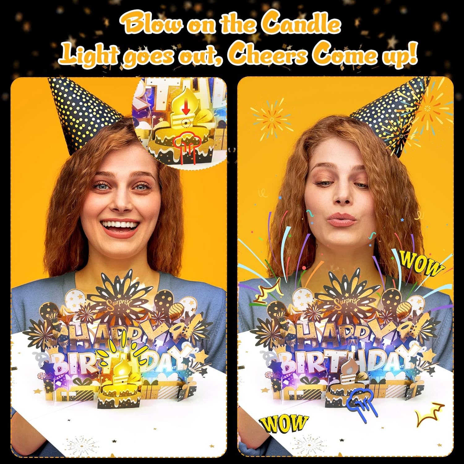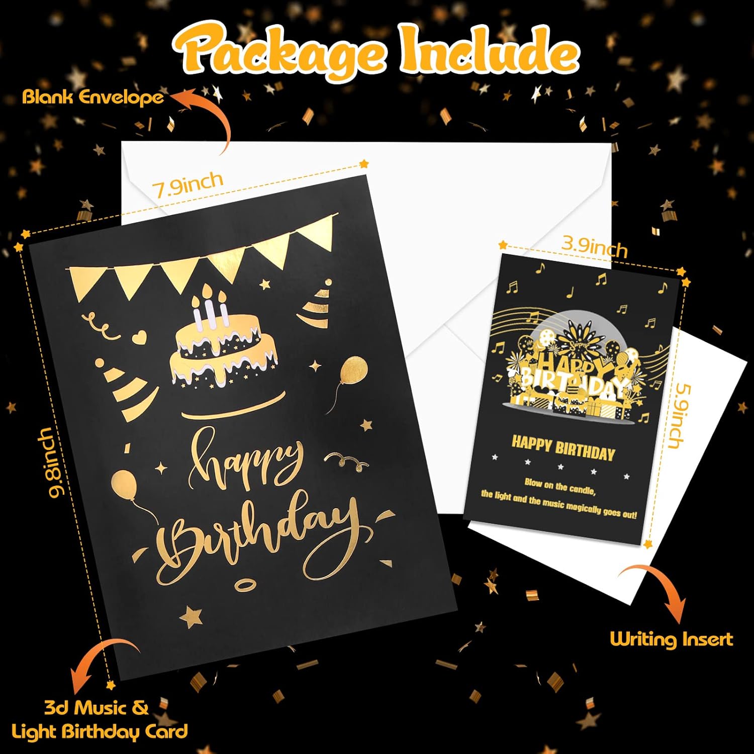 BIRTHDAY CARD WITH LIGHTS AND MUSIC: Warm happy birthday cards with luxury 3D pop-up design that automatically play happy birthday songs are sure to bring a smile to birthday celebrations. Plus, the entire pop-up birthday card design is beautifully bathed in color-changing lights that glow in sync with the music!