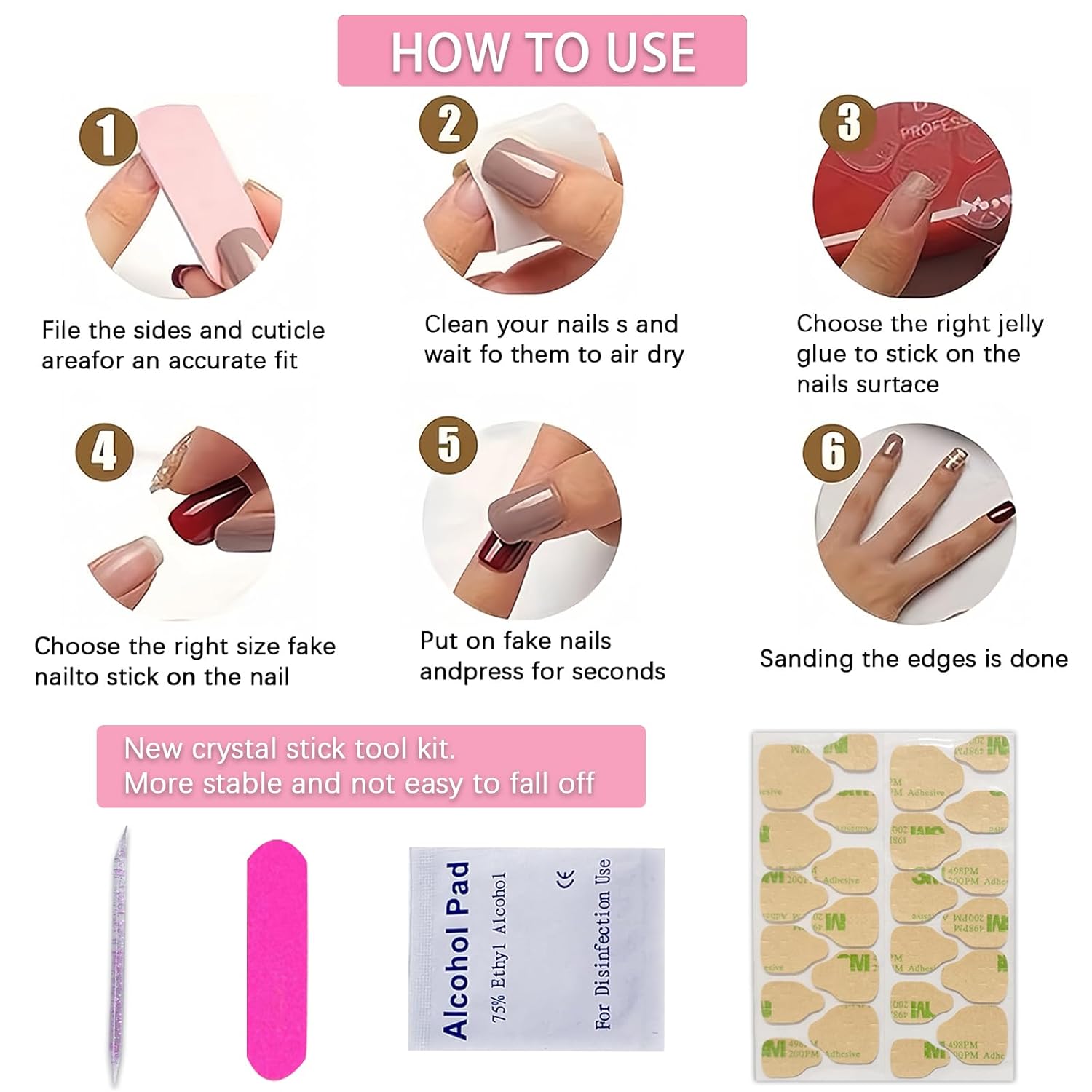 Packaging includes:You will receive 24 black almond fake nails, 24 jelly glue, 1 small wooden stick, alcohol bag, nail file, no additional tools required