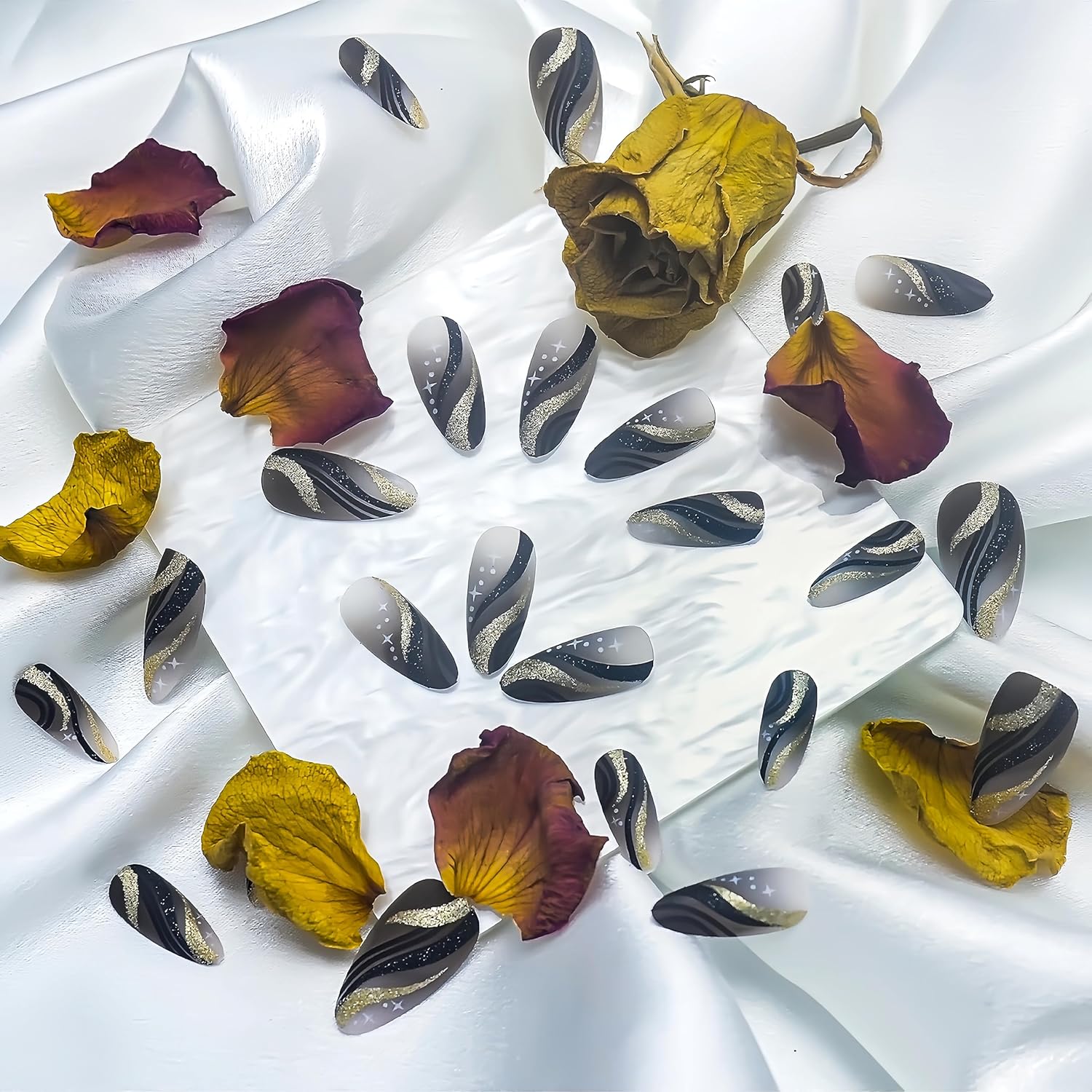 Wide Applications:Black gold line fake nails with nail art designs can be used on various occasions, which can meet your needs at weddings, proms, birthdays, parties, Valentine’s Day dates, and daily life