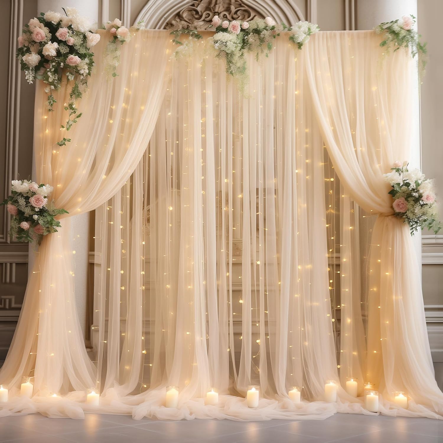 Our champagne sheer backdrop curtain with light is crafted with premium quality sheer translucent organza fabric, this curtain panel features a dramatic effect that will captivate everyone.
