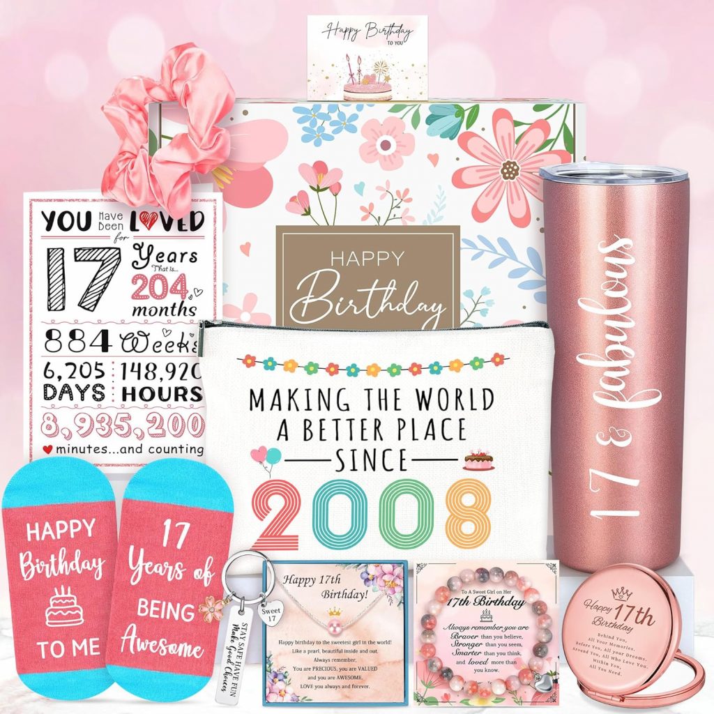 17th Birthday Gifts for Girls 17 Year Old Girl Gift Ideas Birthday Gifts for 17 Year Old Girl Trendy 2025 Happy 17th Birthday Decorations for Girls with Tumbler Socks Makeup Bag Poster Mirror Headband