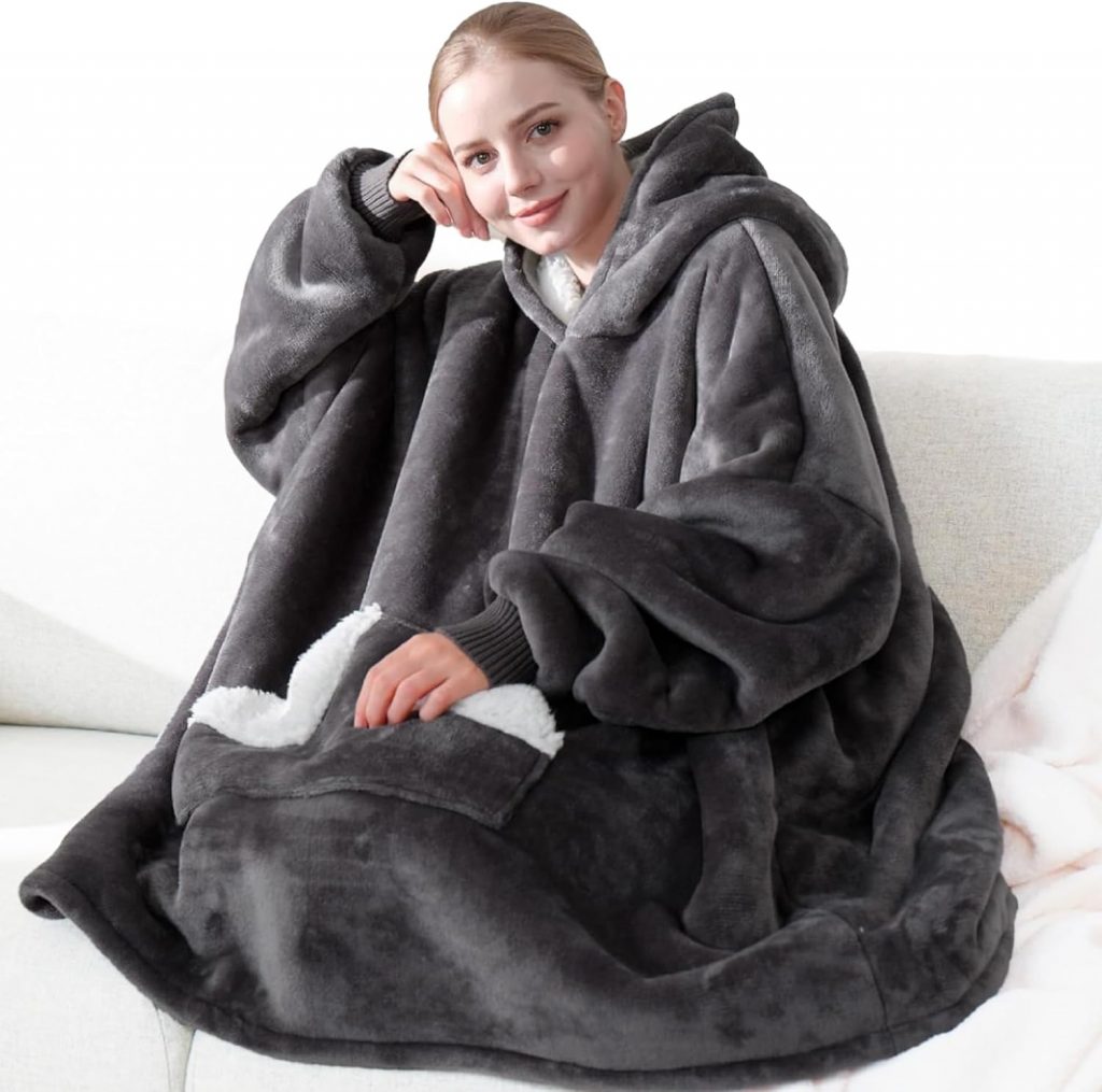 Touchat Wearable Blanket Hoodie, Oversized Sherpa Fleece Sweatshirt Blanket with Giant Hood Pocket and Sleeves for Adult, Warm & Cozy Grey Blanket Gifts for Women